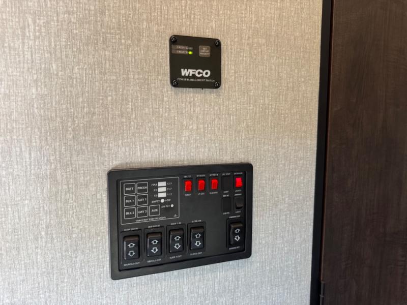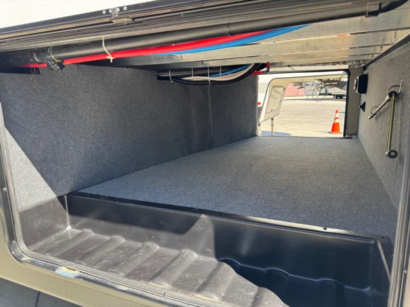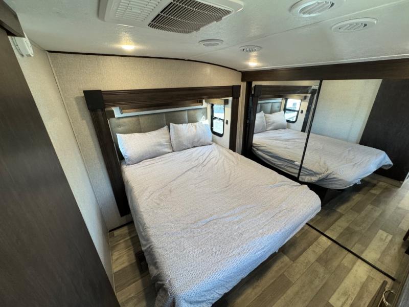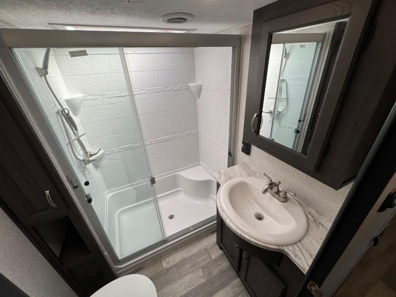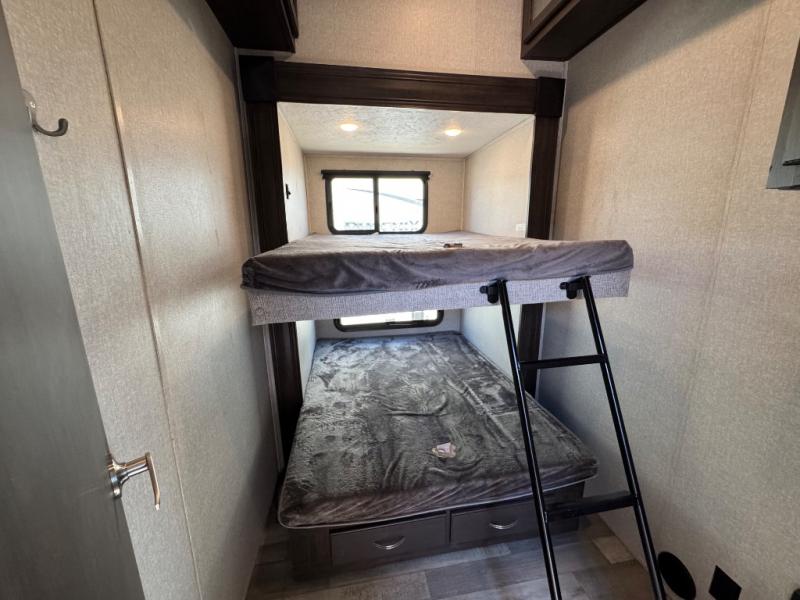 The full bathroom sits between the bunkhouse and master bedroom for easy access. In the master suite, you’ll enjoy a queen bed slide, a large front wall wardrobe with washer/dryer prep, a dresser, and a sliding door that saves space while providing privacy.