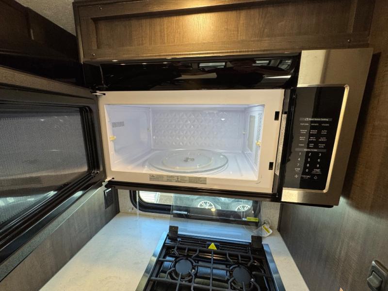 Inside, you’ll find stylish, modern finishes with practical touches like a motion-sensor bathroom light, durable Thermofoil countertops, and an entertainment center prepped for a 50- to 55-inch TV.