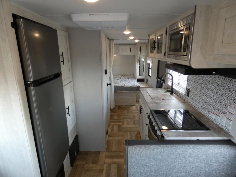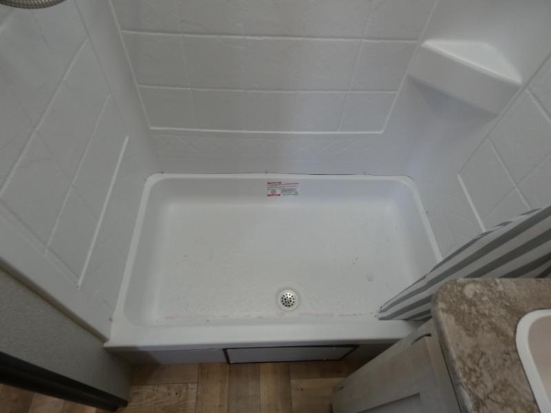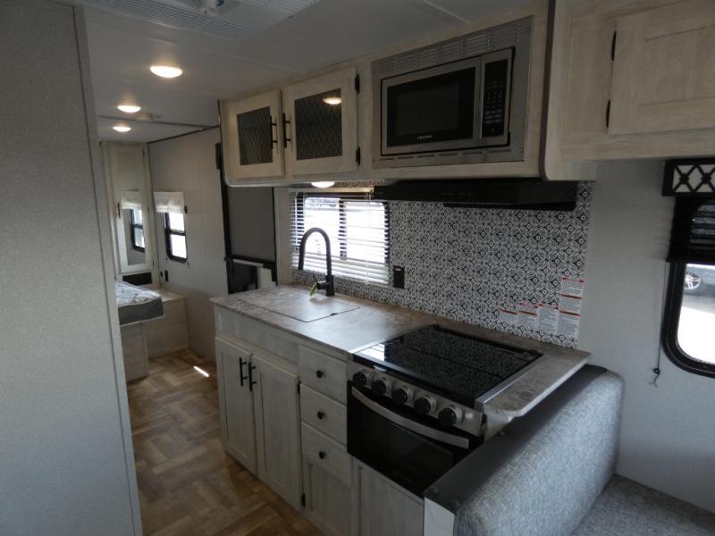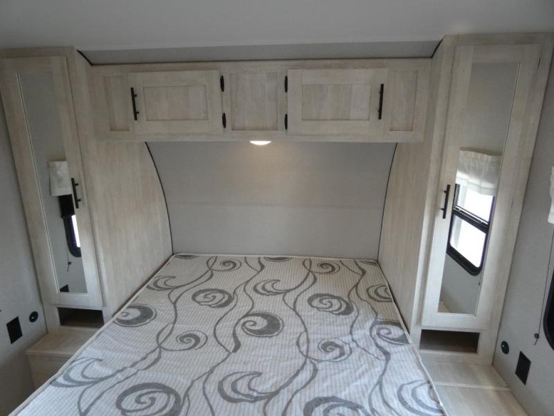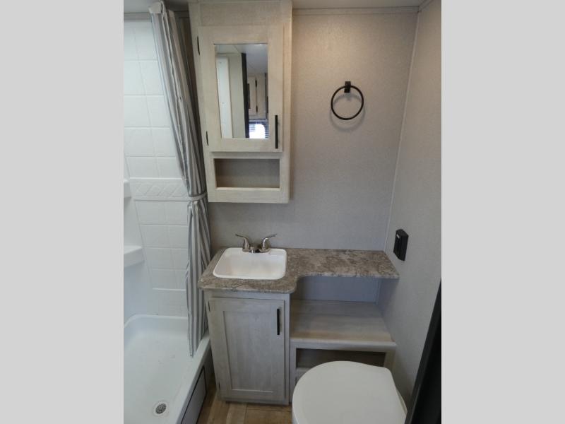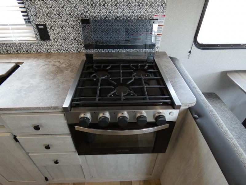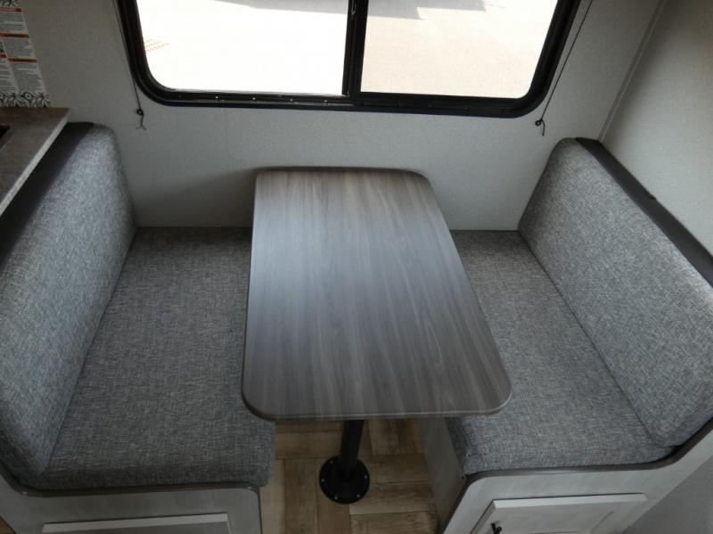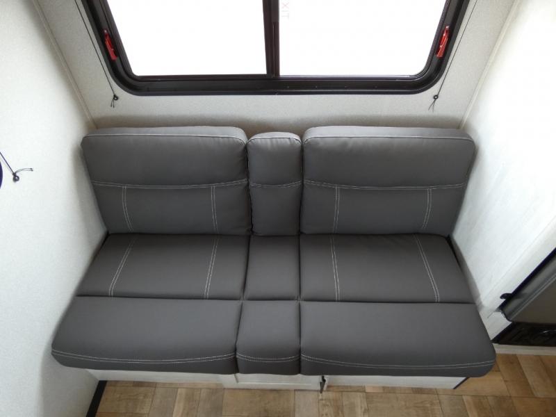 You can enjoy a semi-private bedroom up front with a curtain for privacy when changing in this perfect couples trailer! However, guests or family can sleep on the booth dinette and sofa when needed after dining and visiting. The center kitchen includes full amenities plus a 10 cu. ft. refrigerator and pantry to store all the food. And the full bathroom will allow you to skip the campground facilities, and there is an outside shower to be able to rinse off after a fun day outdoors. There is storage found throughout the interior for clothing, games and such, plus the exterior pass-through compartment will hold more items like camping chairs, fishing poles, and dirty shoes.
