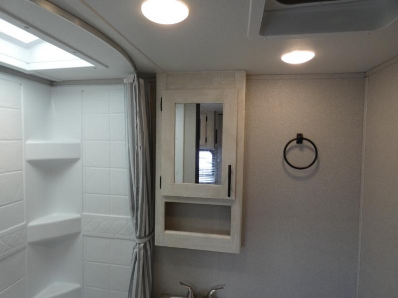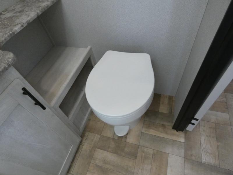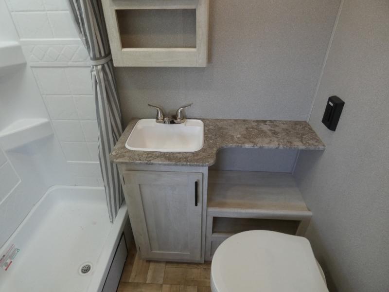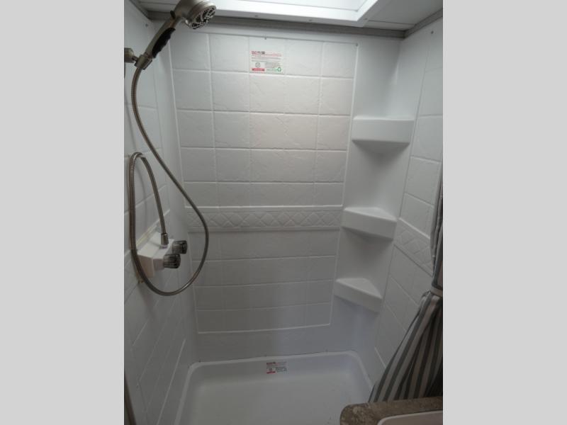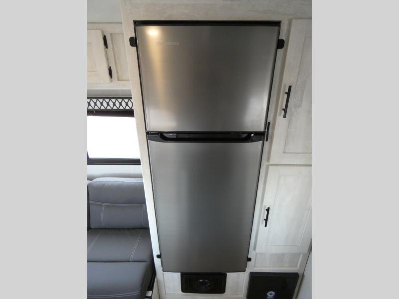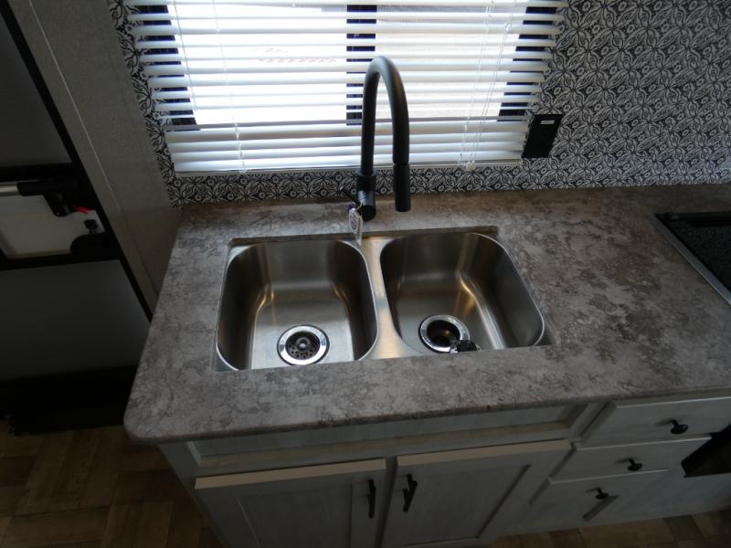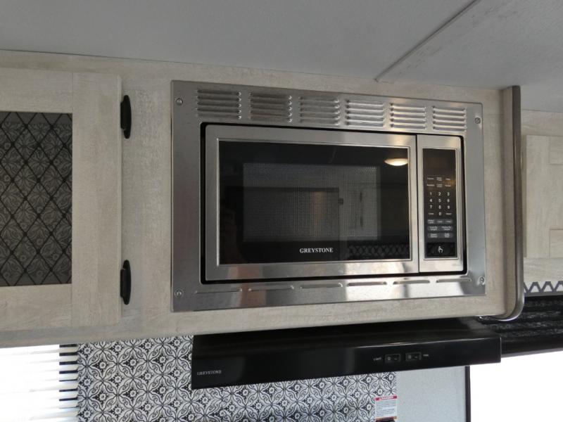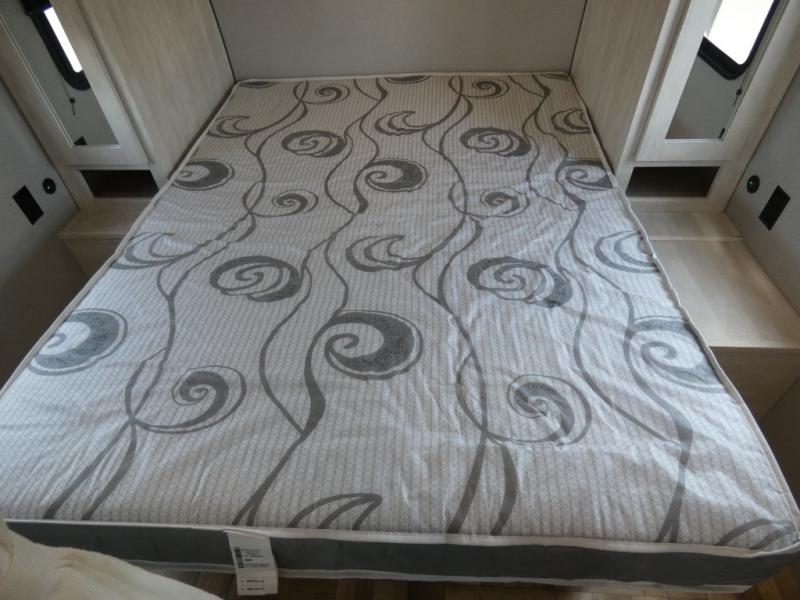You can enjoy a semi-private bedroom up front with a curtain for privacy when changing in this perfect couples trailer! However, guests or family can sleep on the booth dinette and sofa when needed after dining and visiting. The center kitchen includes full amenities plus a 10 cu. ft. refrigerator and pantry to store all the food. And the full bathroom will allow you to skip the campground facilities, and there is an outside shower to be able to rinse off after a fun day outdoors. There is storage found throughout the interior for clothing, games and such, plus the exterior pass-through compartment will hold more items like camping chairs, fishing poles, and dirty shoes.