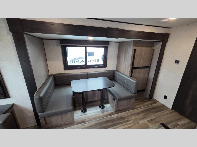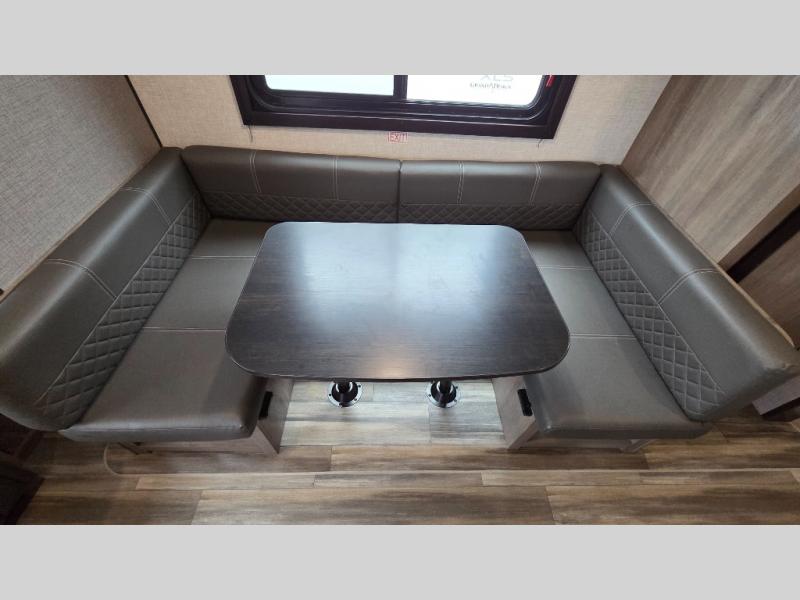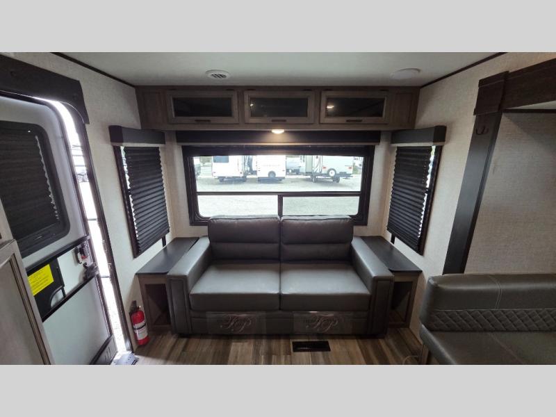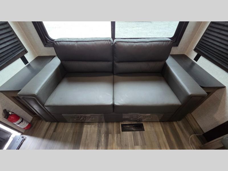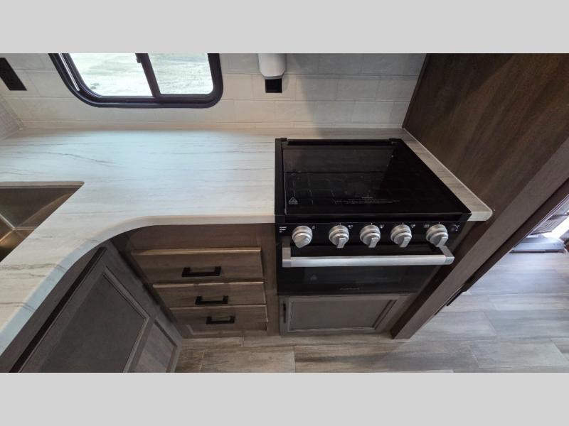 Easily hitch up this dual axle trailer and head out to the campgrounds to enjoy a long weekend or week-long vacation with your favorite person! You might even like to invite a few friends to stay the night on the furniture that doubles as extra sleeping space. The single slide offers more interior floor space to move from the main entry to the walk-through bathroom which offers extra counter space for toiletries, and linen storage for your towels and such. The front bedroom provides a walk-around bed, windows, dual wardrobes and the second entry into the trailer. The cook will love the L-shaped kitchen area, the 17" oven and the three burner range with glass cover. And the exterior offers a 19' power awning to relax under when outside.