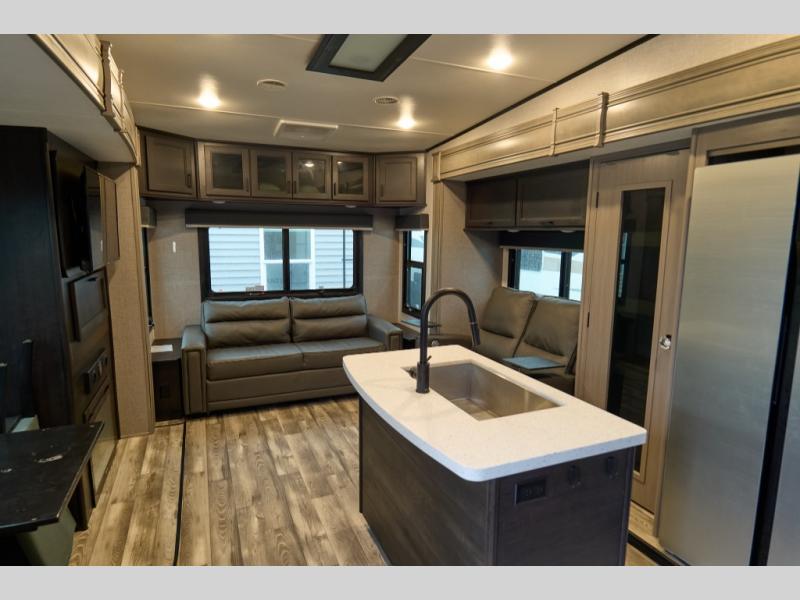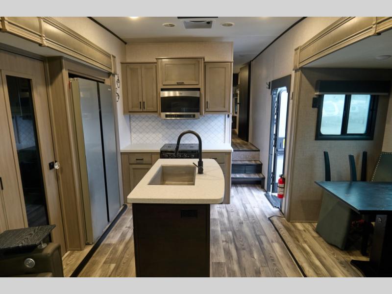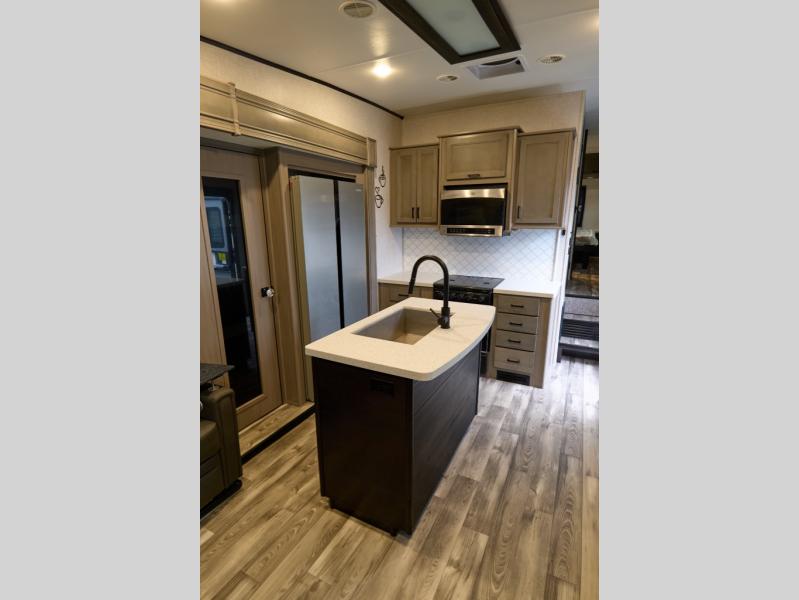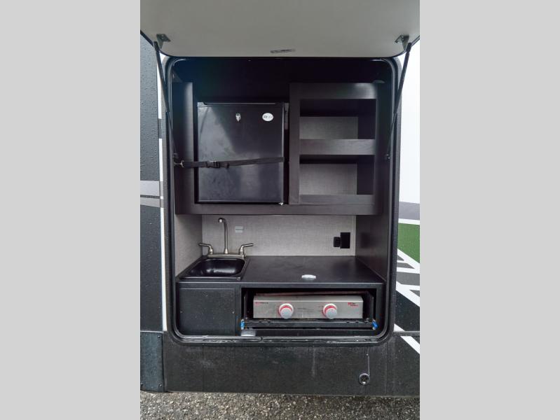 You'll have lots of fun in this fifth wheel! Enjoy the most comfortable living room with a tri-fold sofa, theater seats, and an entertainment center with fireplace. A center kitchen island allows an easy flow between the rooms, while the dining table and chairs provide additional seating. A 16 cu. ft. refrigerator has plenty of room for all your food, and there's a large pantry as well. The full bath includes a shower and has dual entry doors so you can access from the hall or the bedroom. A spacious wardrobe also includes prep for the optional washer and dryer. Outside you'll find another kitchen, with a refrigerator and griddle, plus there's a quick connect LP hookup to add a grill easily.