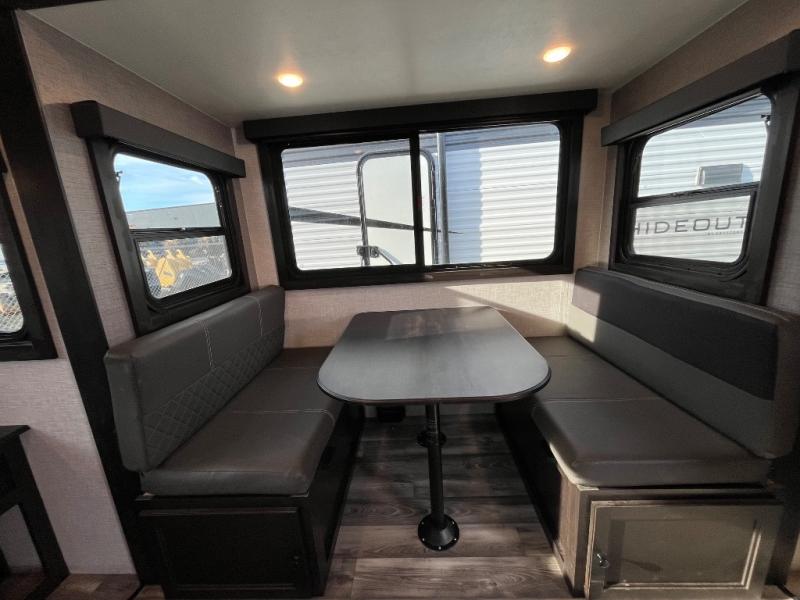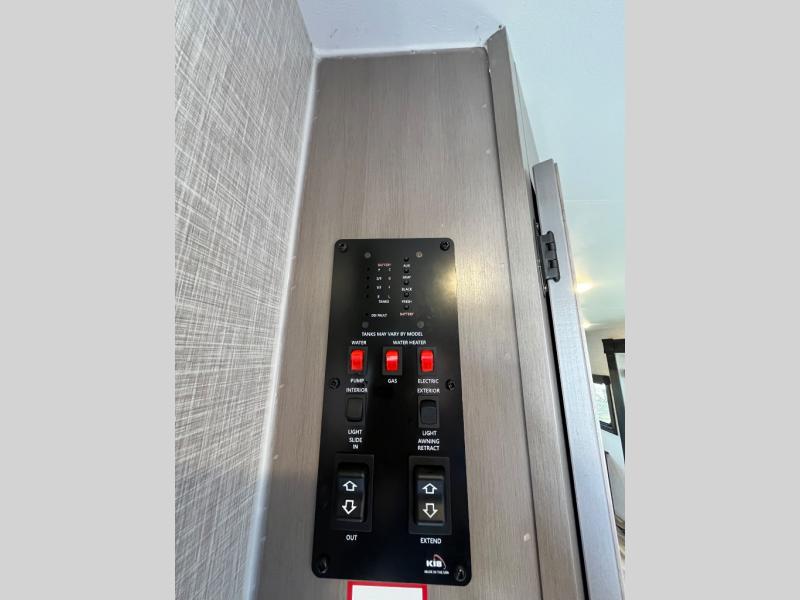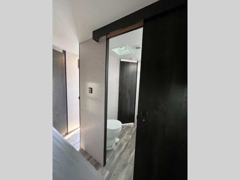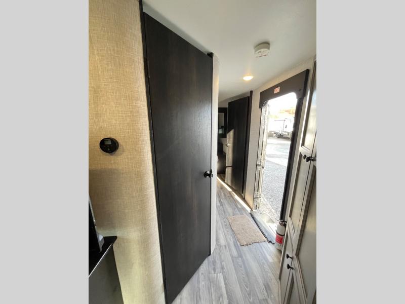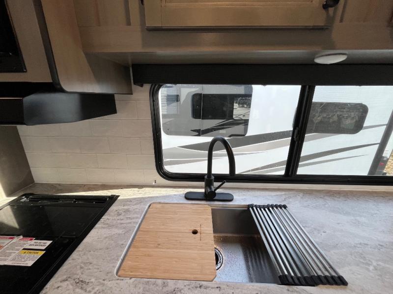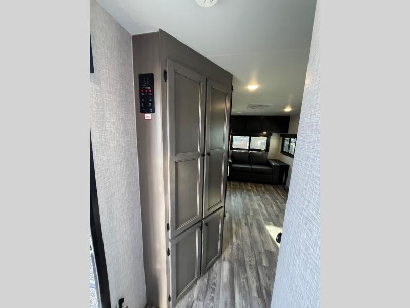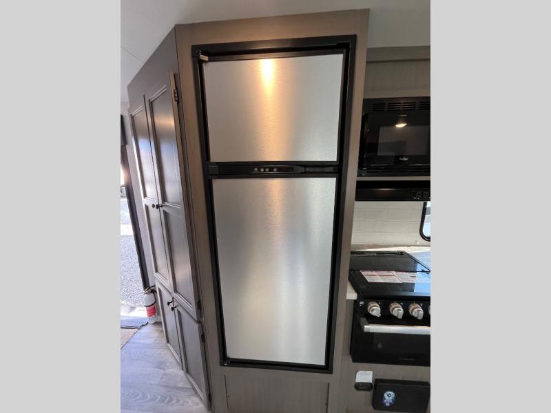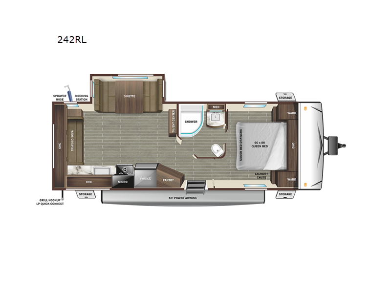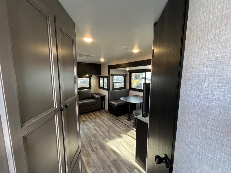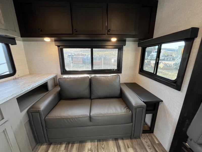 Venture to see new places with this trailer in tow. You can easily set up the booth dinette slide and the 18' power awning, and start relaxing or exploring outdoors! The rear tri-fold sofa has an end table and kitchen counter space to place your things when the cook doesn't need the counter space to prepare and serve meals. The corner pantry will come in handy when loading and unloading as well as grabbing goodies as you exit the trailer. Everyone can watch the smart HDTV while dining at the dinette, and both of the furnishings in this area offer sleeping space at night. The dual-entry bath is convenient for all, and the front master will give you an escape with a queen bed, dual wardrobes, a laundry chute and windows for views of your campsite.