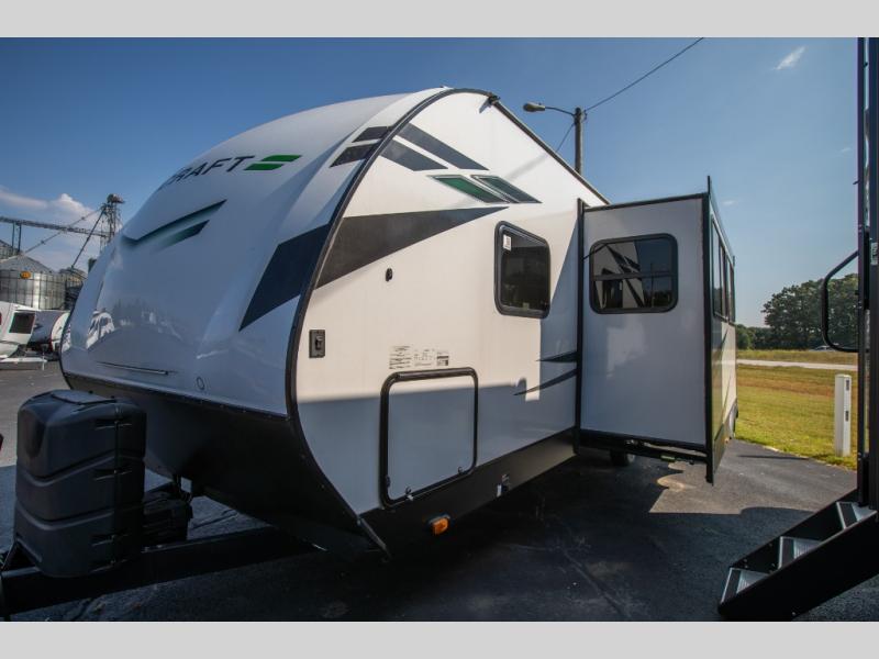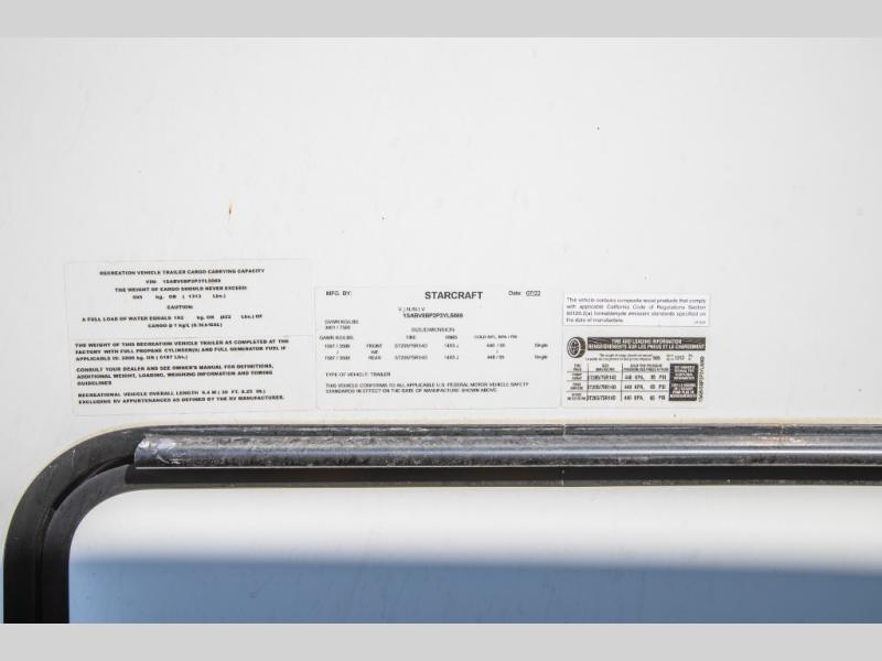 With any Starcraft Super Lite travel trailer, the solid and lightweight construction includes a fully walkable roof with a PVC roofing membrane that easily reflects solar heat and UV rays and TuffShell vacuum bonded laminated construction, reinforced with heavy-duty fiberglass and welded aluminum frames. There is also a molded front cap with LED lighting to protect against elements, a power tongue jack for easy towing, plus a power awning with LED lighting. The interior is spacious with an 81" living room ceiling height, hardwood cabinet doors, and flush floor slides with residential vinyl flooring and pressed membrane countertops for easy cleanup. Don't wait for your next adventure, take a Super Lite with you today!