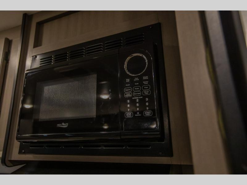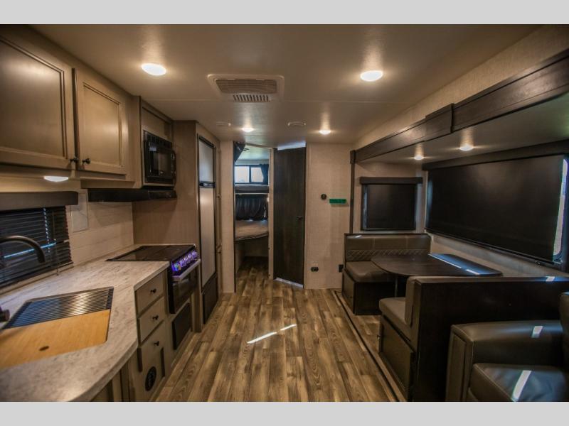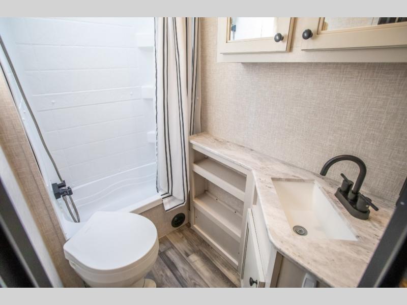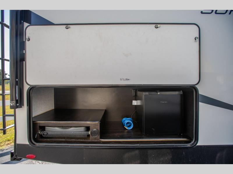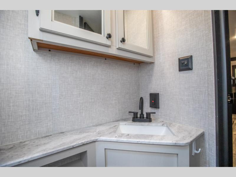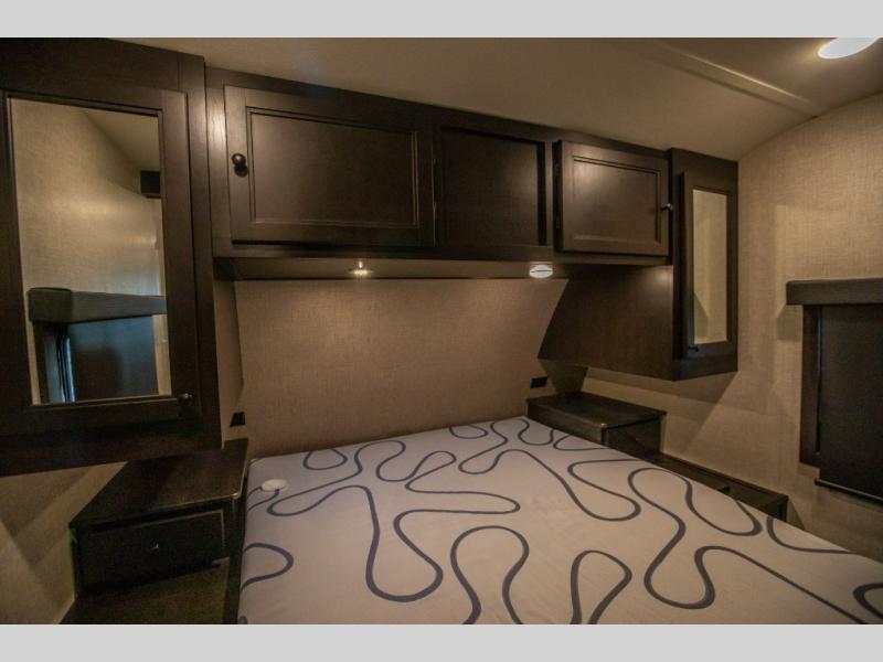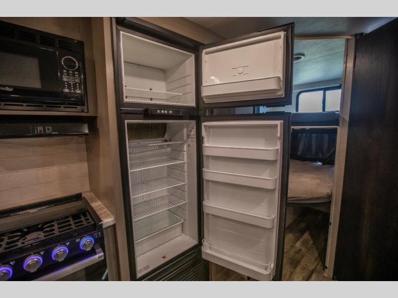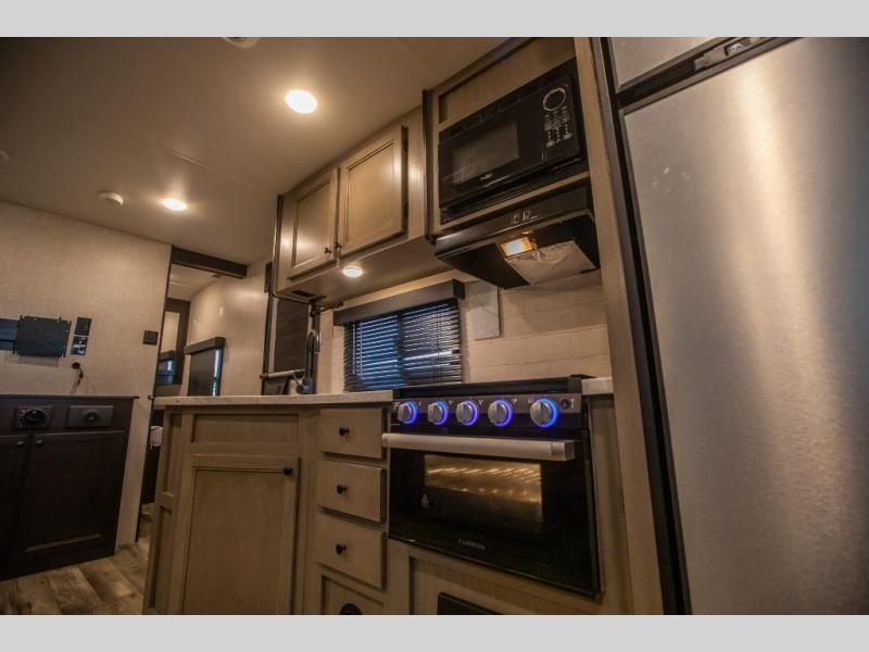 You will love the amount of storage space you'll find inside and outside this travel trailer. There is plenty of sleeping for a larger group also between the slide out in the main area with a dinette and tri-fold sofa, the double-size bunks next to the rear corner full bathroom, and the queen bed in the front bedroom with access to each side with its own sliding door. The cook will have full amenities including a pantry for storage, a single basin stainless steel under-mount kitchen sink with a residential high-rise faucet and overhead cabinets for more items. And they can cook on the outside kitchen with an exterior fridge for more beverages while others relax under the 20' 6" power awning with LED lighting so everyone can stay up late and enjoy the outdoors.