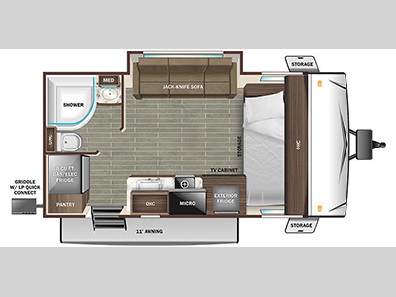 This Super Lite Maxx travel trailer has all of the essentials in an easy-to-tow package! Your interior is outfitted with residential vinyl flooring and hardwood cabinetry, plus blackout roller shades for privacy. The full bathroom has a radius shower which is essential to have if you want to get away in seclusion, and the skylight and roof vent keep the bathroom fresh. The two-burner recessed range and convection microwave will help you keep your belly full, and you can keep the refrigerator full of special goodies and healthy foods. You will also find a pantry directly to the left of the entry door.