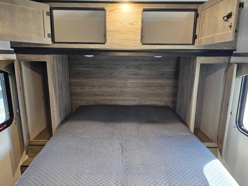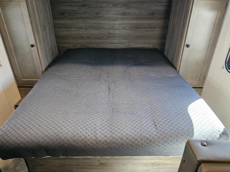 Front RV queen bed (60" x 74") with overhead cabinets for storage