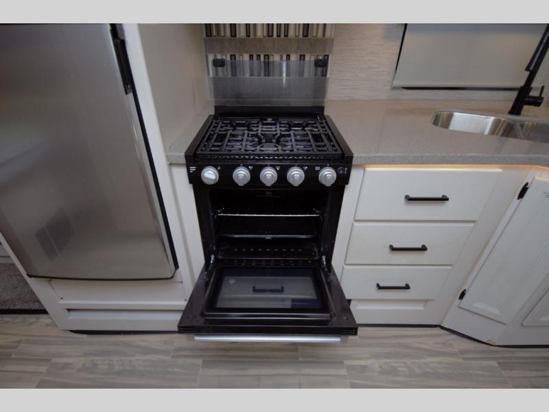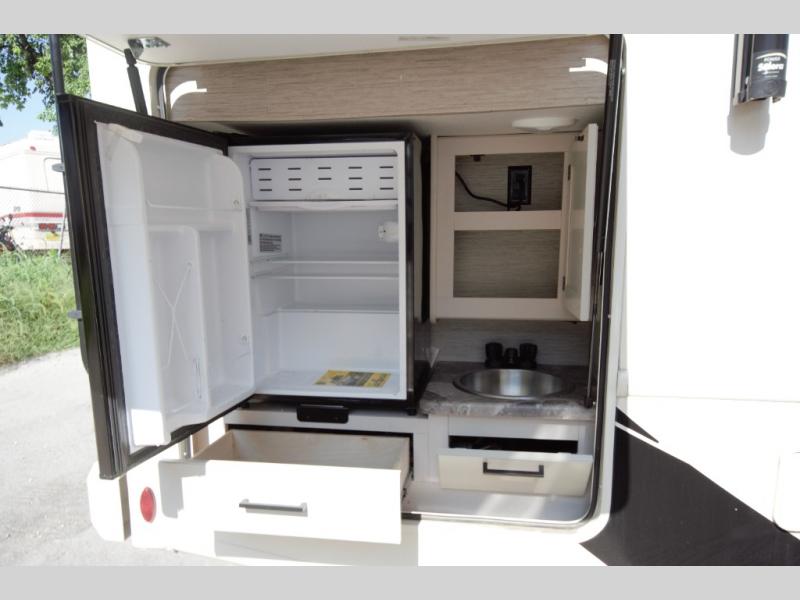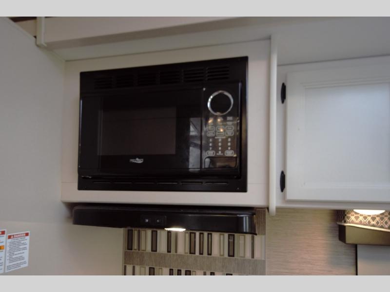 The full wall slide opens up the entire living space, giving you more room to relax. The kitchen includes a three burner gas cooktop and a microwave oven. Cook outdoors too with the exterior kitchen. The full bathroom and private king bedroom offer home like comfort, complete with closet storage and a 32 inch bedroom TV.