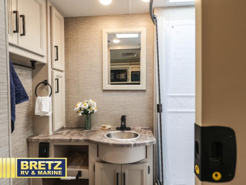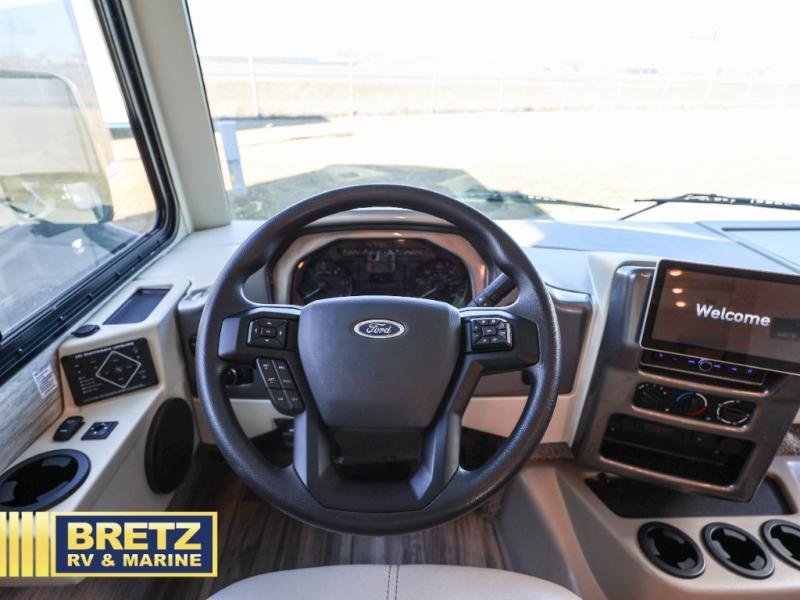 The A.C.E Class A gas motorhome is constructed with a welded tubular steel floor, vacu-bond laminated roof, walls and floor with block foam insulation, and a premium one-piece exterior roof for a coach made to last. You will love the pet-friendly features, like the Bird's Eye window, the Pet-Link multi-purpose tie-down and the Pull-Out Kibble Station with an FDS approved pet bowl liner. Each model includes an Onan RV QG 4,000 gas generator, a Winegard ConnecT Wi-Fi extender +4G, and are pre-wired for solar charging. Some of the other convenient amenities you will find on the A.C.E are frameless windows, a basement pass-through storage, and an exterior LP connection. Head inside to find residential vinyl flooring, pressed laminate countertops, glass tile backsplash in the kitchen, and a designer headboard, bedspread and pillow shams in the bedroom for all-around comfort!