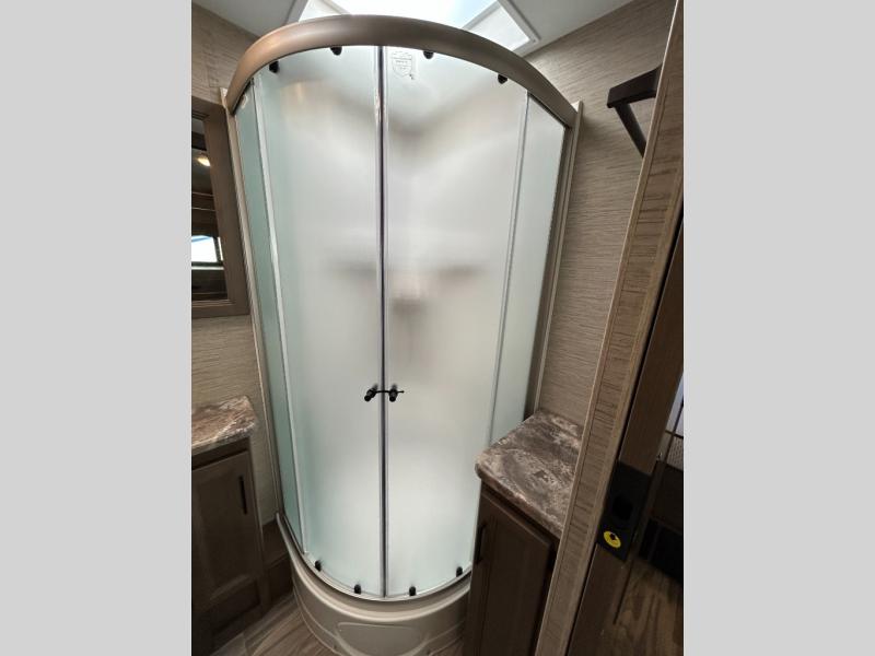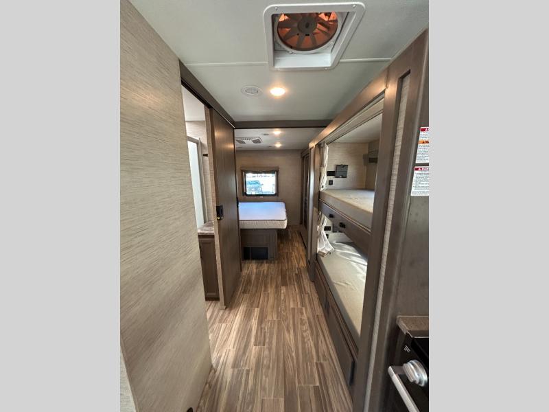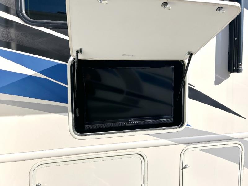 Are you looking for a motorhome with more space and comfort? Your search is over with this family-friendly coach that can sleep eight people each night. The kids will love the bunk beds and the drop-down overhead bunk up front, while you enjoy the king bed in the rear bedroom. There is also a Dream Dinette and a jack-knife sofa across from the 39" TV for easy viewing. Home-cooked meals can be prepared on the three burner gas cooktop or in the microwave oven, and leftovers can go in the double door refrigerator. This model also includes a spacious full bath with a linen closet, a shower skylight, and a sleek glass shower door!