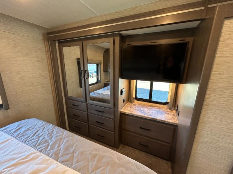 Are you looking for a motorhome with more space and comfort? Your search is over with this family-friendly coach that can sleep eight people each night. The kids will love the bunk beds and the drop-down overhead bunk up front, while you enjoy the king bed in the rear bedroom. There is also a Dream Dinette and a jack-knife sofa across from the 39" TV for easy viewing. Home-cooked meals can be prepared on the three burner gas cooktop or in the microwave oven, and leftovers can go in the double door refrigerator. This model also includes a spacious full bath with a linen closet, a shower skylight, and a sleek glass shower door!