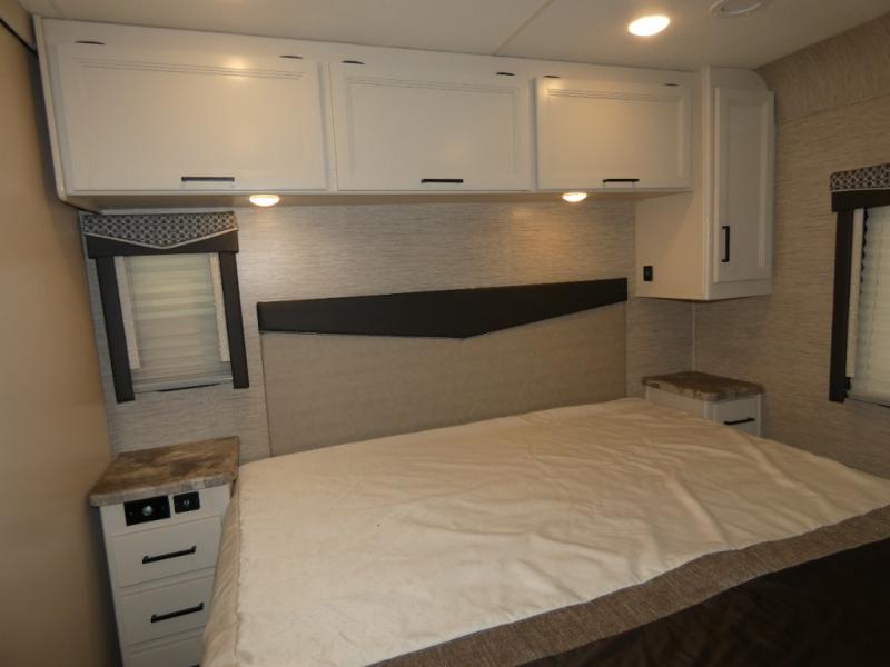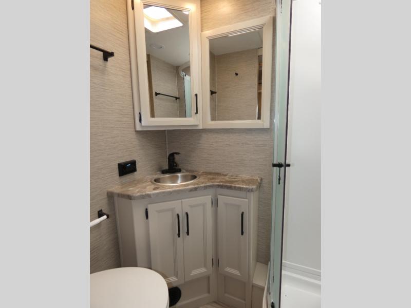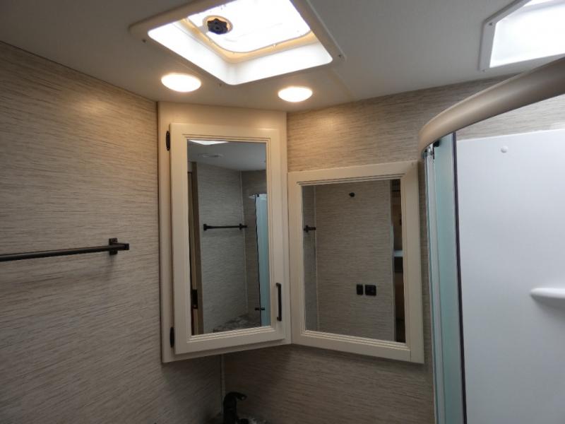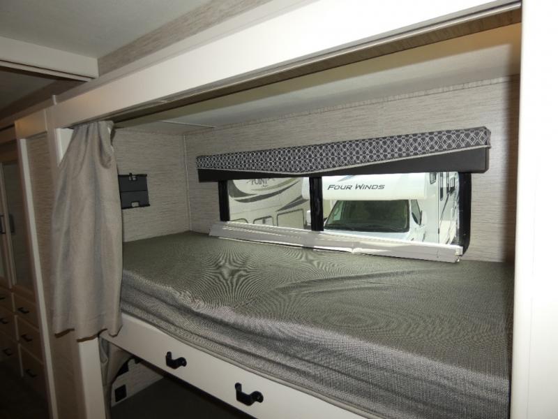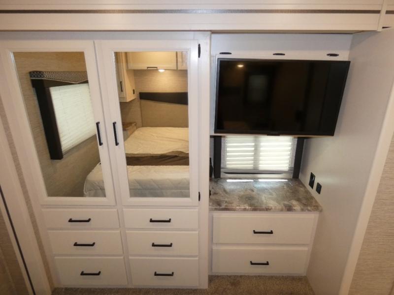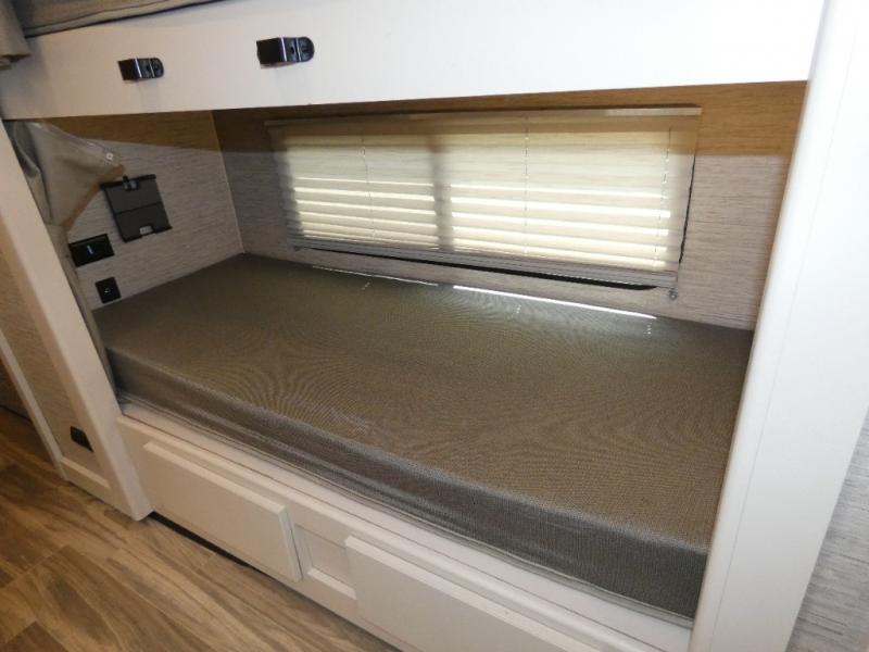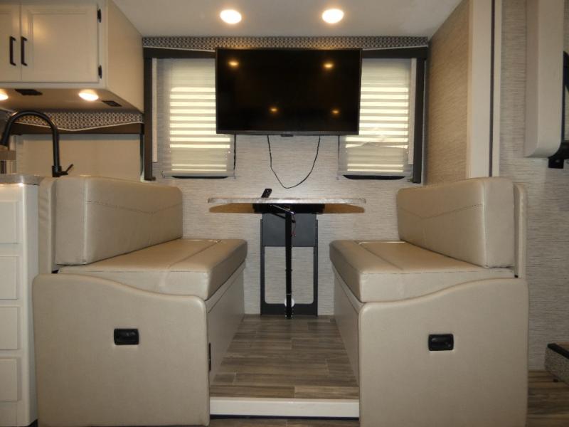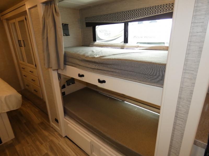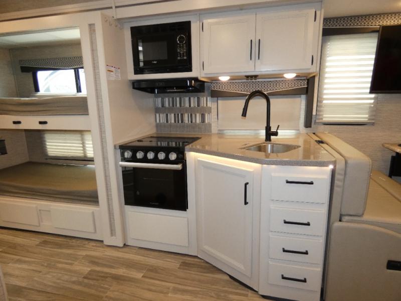 Are you looking for a motorhome with more space and comfort? Your search is over with this family-friendly coach that can sleep eight people each night. The kids will love the bunk beds and the drop-down overhead bunk up front, while you enjoy the king bed in the rear bedroom. There is also a Dream Dinette and a jack-knife sofa across from the 39" TV for easy viewing. Home-cooked meals can be prepared on the three burner gas cooktop or in the microwave oven, and leftovers can go in the double door refrigerator. This model also includes a spacious full bath with a linen closet, a shower skylight, and a sleek glass shower door!