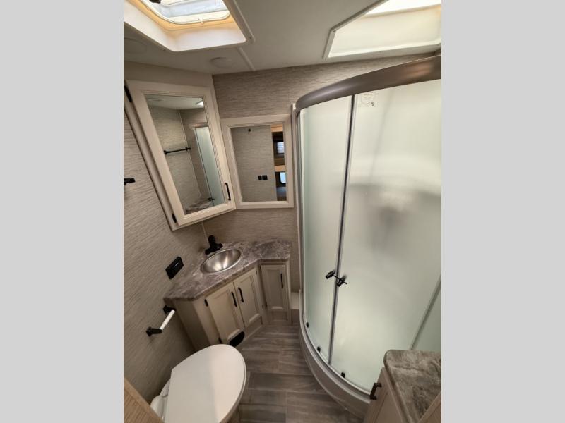 Are you looking for a motorhome with more space and comfort? Your search is over with this family-friendly coach that can sleep eight people each night. The kids will love the bunk beds and the drop-down overhead bunk up front, while you enjoy the king bed in the rear bedroom. There is also a Dream Dinette and a jack-knife sofa across from the 39" TV for easy viewing. Home-cooked meals can be prepared on the three burner gas cooktop or in the microwave oven, and leftovers can go in the double door refrigerator. This model also includes a spacious full bath with a linen closet, a shower skylight, and a sleek glass shower door!