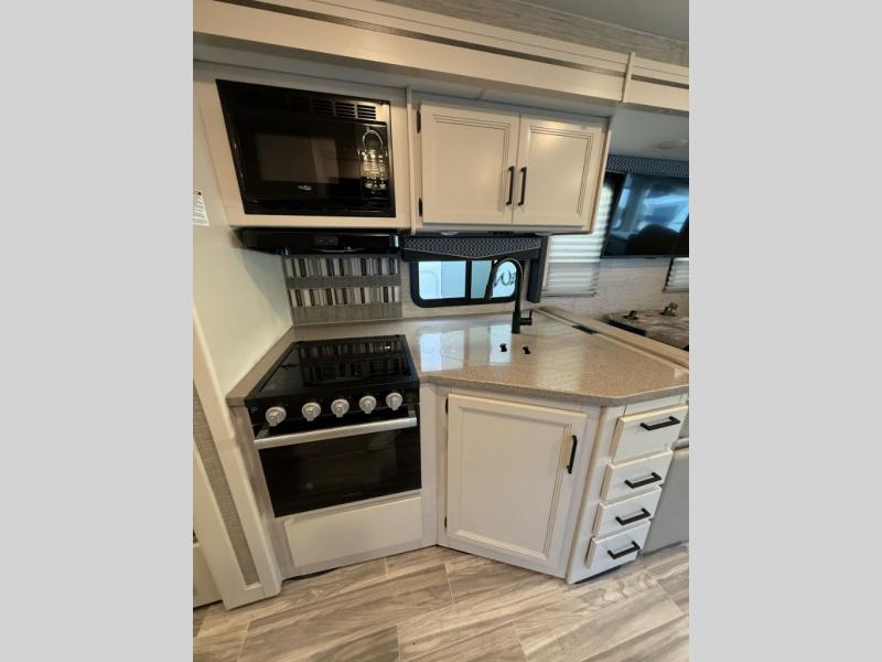 The A.C.E Class A gas motorhome is constructed with a welded tubular steel floor, vacu-bond laminated roof, walls and floor with block foam insulation, and a premium one-piece exterior roof for a coach made to last. You will love the pet-friendly features, like the Bird's Eye window, the Pet-Link multi-purpose tie-down and the Pull-Out Kibble Station with an FDS approved pet bowl liner. Each model includes an Onan RV QG 4,000 gas generator, a Winegard ConnecT Wi-Fi extender +4G, and are pre-wired for solar charging. Some of the other convenient amenities you will find on the A.C.E are frameless windows, a basement pass-through storage, and an exterior LP connection. Head inside to find residential vinyl flooring, pressed laminate countertops, glass tile backsplash in the kitchen, and a designer headboard, bedspread and pillow shams in the bedroom for all-around comfort!
