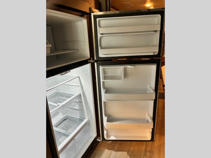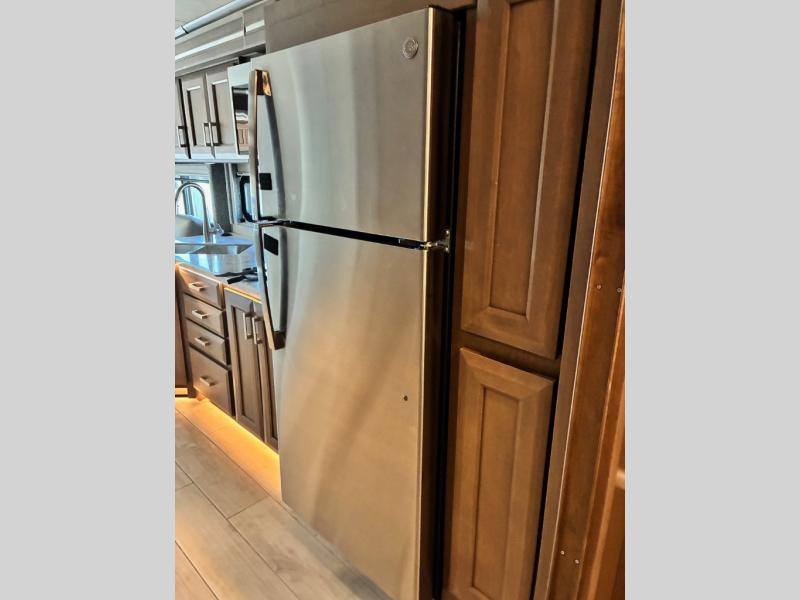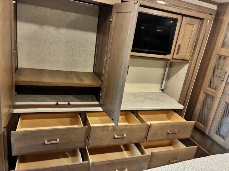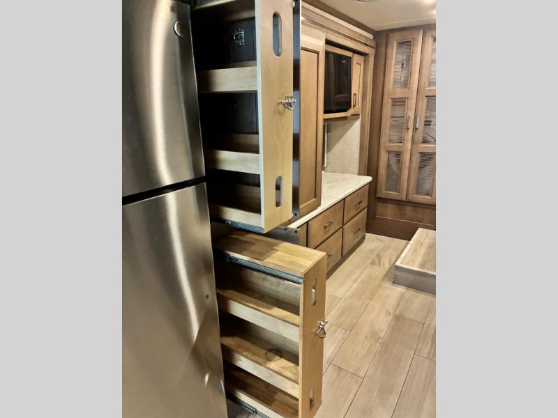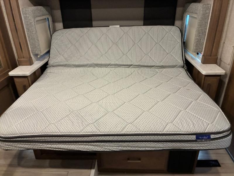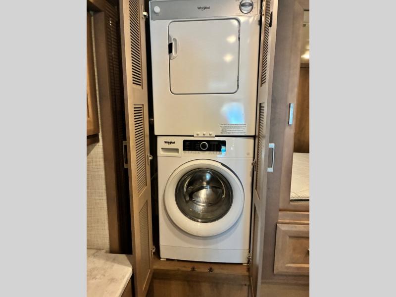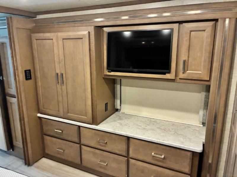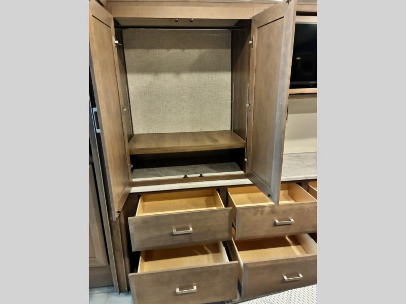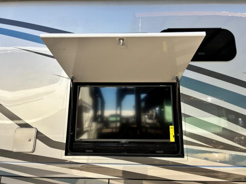 Making your way to the campgrounds is just the beginning of your comfortable journey! Once at your destination, you can continue relaxing inside with beautiful decor, cozy seating, and sleeping space for six so you can invite overnight guests! The galley kitchen has an electric induction cooktop, a convection microwave oven, and a residential refrigerator, plus a pantry for the cook to be able to feed everyone. You can relax on the reclining theater seats, at the Dream dinette, and on the captain's chairs that swivel. The full bathroom has extra counter space for toiletries and such, and the private rear bedroom offers a Tilt-A-View inclining king bed for ultimate comfort, a stackable washer/dryer to keep everything clean, and two wardrobes. You will find a TV in the living area, over the cockpit, in the bedroom, and outside for maximum entertainment. And the drop-down overhead bunk is a great place for kids or grandkids to sleep.
