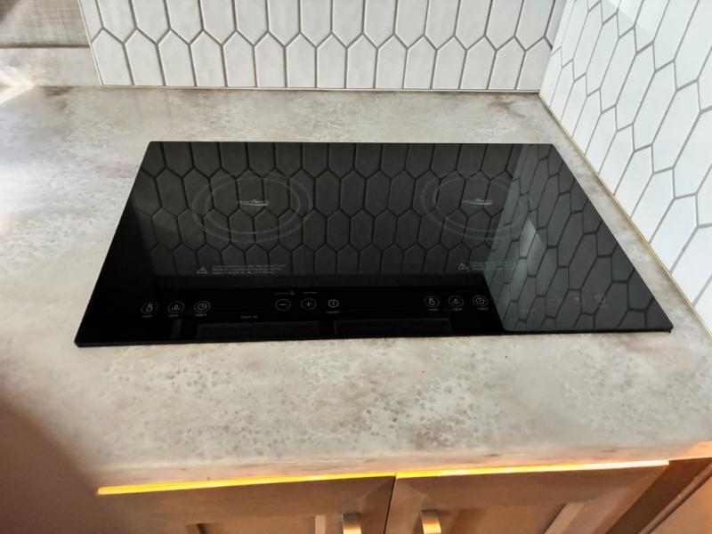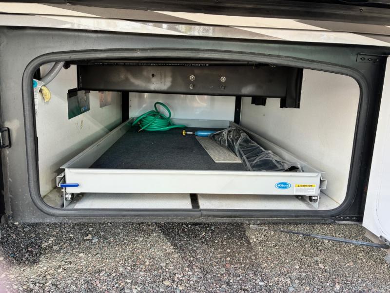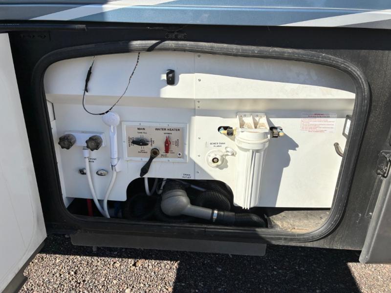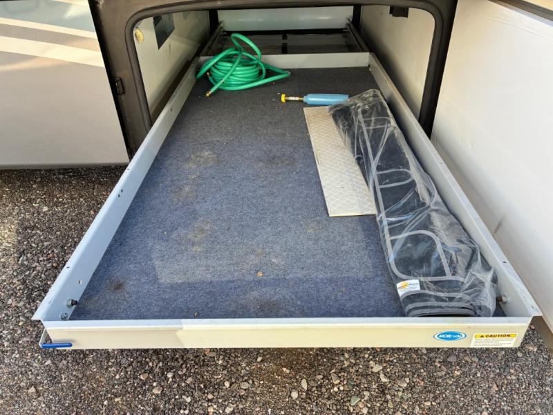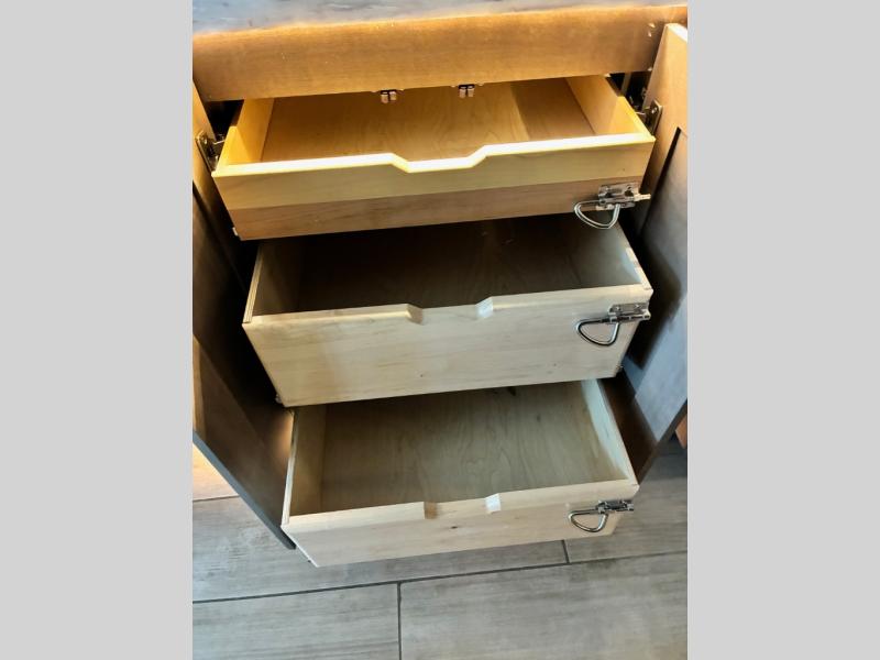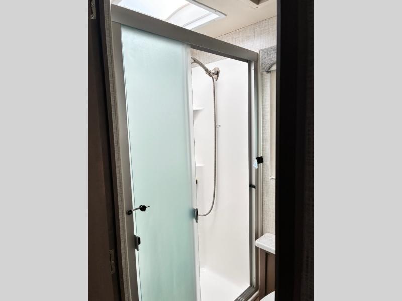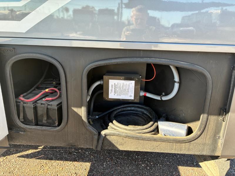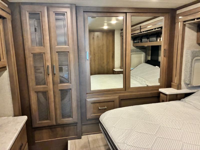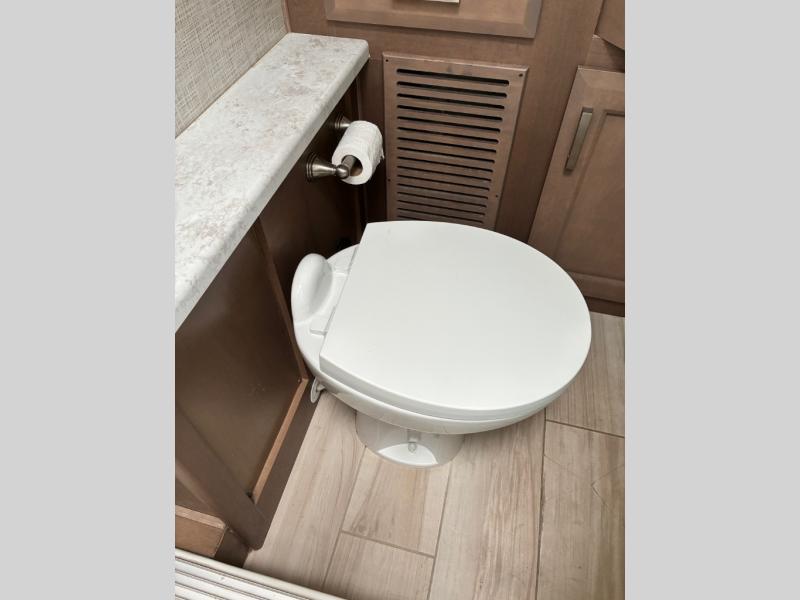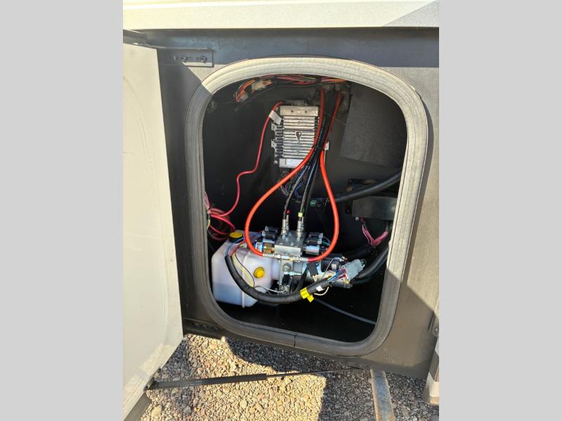 Making your way to the campgrounds is just the beginning of your comfortable journey! Once at your destination, you can continue relaxing inside with beautiful decor, cozy seating, and sleeping space for six so you can invite overnight guests! The galley kitchen has an electric induction cooktop, a convection microwave oven, and a residential refrigerator, plus a pantry for the cook to be able to feed everyone. You can relax on the reclining theater seats, at the Dream dinette, and on the captain's chairs that swivel. The full bathroom has extra counter space for toiletries and such, and the private rear bedroom offers a Tilt-A-View inclining king bed for ultimate comfort, a stackable washer/dryer to keep everything clean, and two wardrobes. You will find a TV in the living area, over the cockpit, in the bedroom, and outside for maximum entertainment. And the drop-down overhead bunk is a great place for kids or grandkids to sleep.