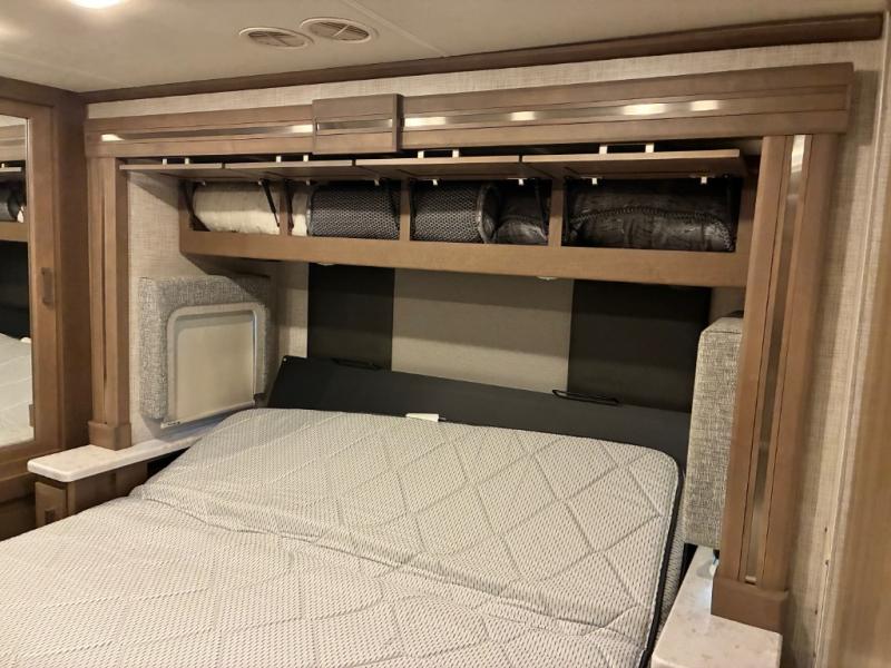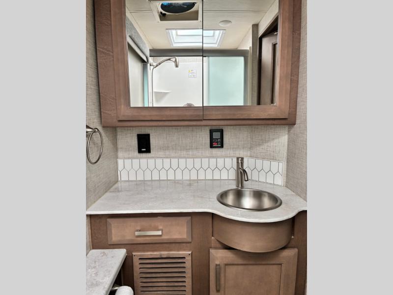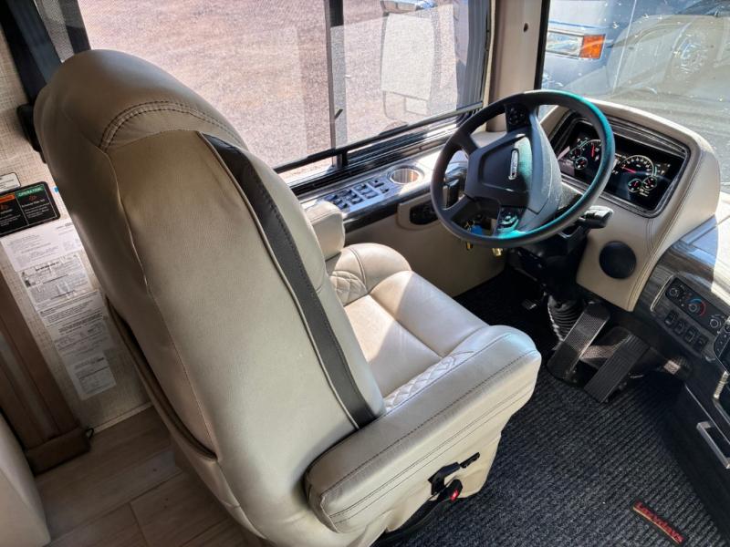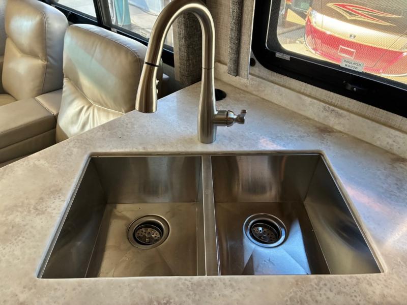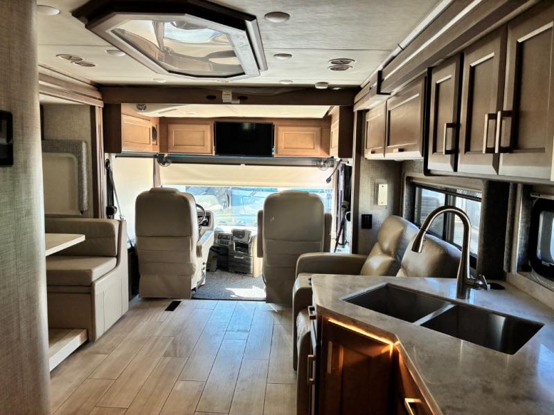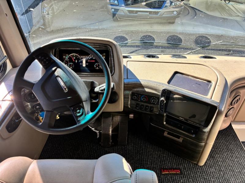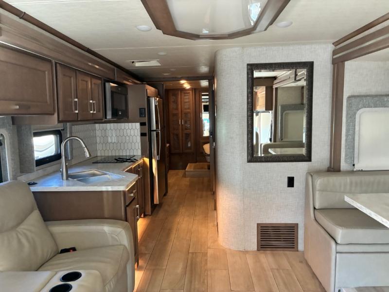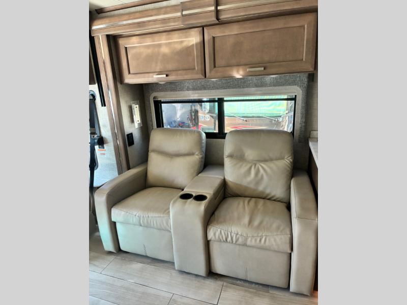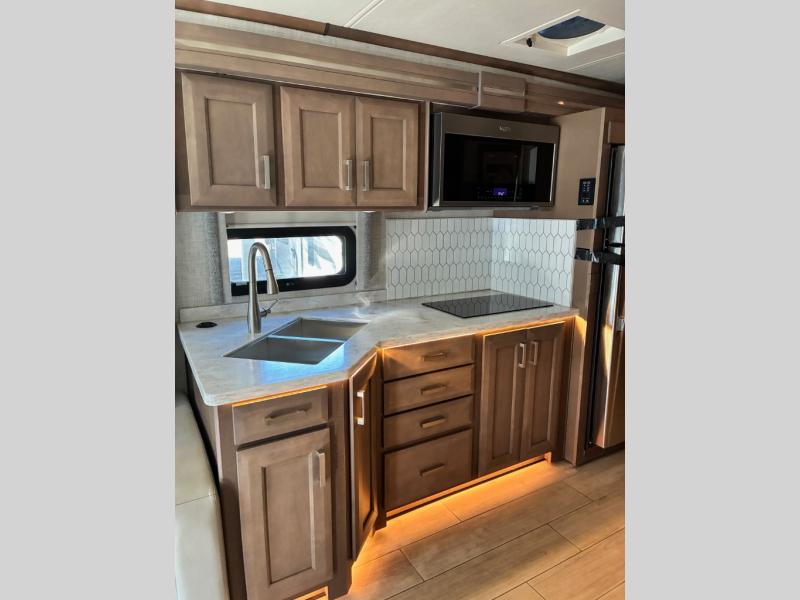 With any Aria Class A diesel motorhome by Thor Motor Coach, experience RV living with all the luxurious amenities you are accustom to, command the roadways with improved handling from the l-beam front axle with a 55-degree wheel cut, and enjoy a smooth ride thanks to the Air-Ride suspension and Sachs shock absorbers. The driver will also appreciate the 10.1" touchscreen dash radio with Bluetooth, navigation, and Sirius/XM prep when navigating the roads, and the comfort of the leatherette reclining/swivel adjustable captain's chairs. The bathroom provides an oversized full height shower with a glass door and a designer backsplash, while the kitchen provides solid surface countertops and a dinette. You'll also enjoy designer tile backsplash, a large double bowl stainless steel sink with a single handle faucet, a pull-down sprayer, plus full kitchen amenities. More standout features include the Studio Collection cabinetry with rake style doors and matte finish, living room pin-up lights, and polished porcelain tile flooring, plus much much more depending on the Aria you take on the road!