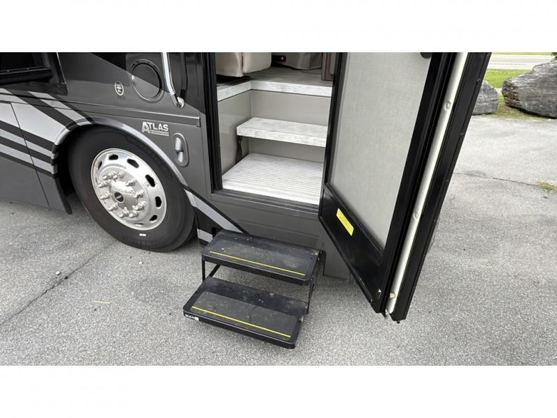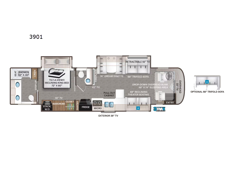 Convenience, comfort, and space can be found throughout this coach with a rear full bathroom with dual sinks and a mid-coach half bath, plus three slide outs, and captain's chairs that swivel. You can entertain your family and friends with all the seating and seatbelts that allow you to invite everyone. The Dream dinette, the trifold sofa, and the reclining theater seats are all great places to relax, unwind, and visit. Everyone will surely enjoy the fireplace, the 43" TV, and/or the 55" retractable TV, plus there is a 32" over the cab. Cooking is made easy with a convection microwave oven and electric induction cooktop, plus there is a residential refrigerator and a pantry for food storage. When you are ready to call it a night, the Tilt-A-View inclining king bed will be waiting in the walk-through bedroom that leads you to the full bathroom!