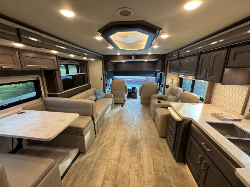 With any Aria Class A diesel motorhome by Thor Motor Coach, experience RV living with all the luxurious amenities you are accustom to, command the roadways with improved handling from the l-beam front axle with a 55-degree wheel cut, and enjoy a smooth ride thanks to the Air-Ride suspension and Sachs shock absorbers. The driver will also appreciate the 10.1" touchscreen dash radio with Bluetooth, navigation, and Sirius/XM prep when navigating the roads, and the comfort of the leatherette reclining/swivel adjustable captain's chairs. The bathroom provides an oversized full height shower with a glass door and a designer backsplash, while the kitchen provides solid surface countertops and a dinette. You'll also enjoy designer tile backsplash, a large double bowl stainless steel sink with a single handle faucet, a pull-down sprayer, plus full kitchen amenities. More standout features include the Studio Collection cabinetry with rake style doors and matte finish, living room pin-up lights, and polished porcelain tile flooring, plus much much more depending on the Aria you take on the road!