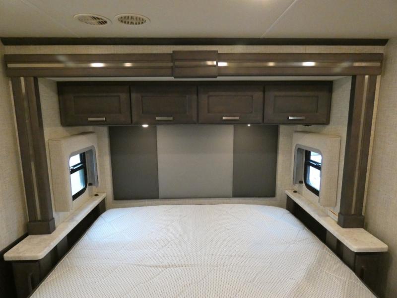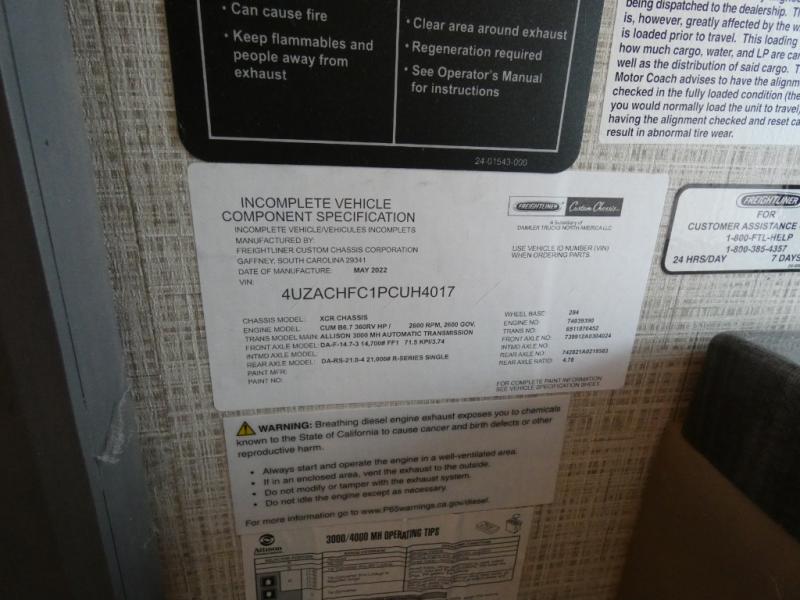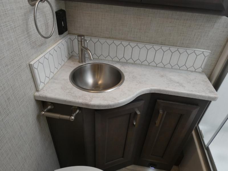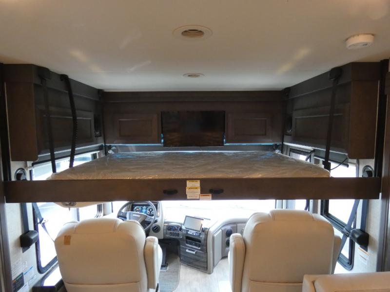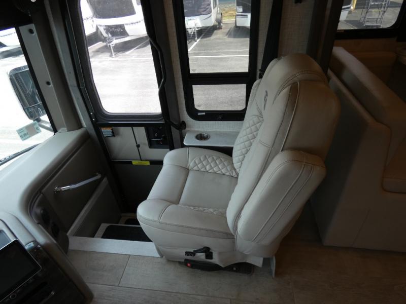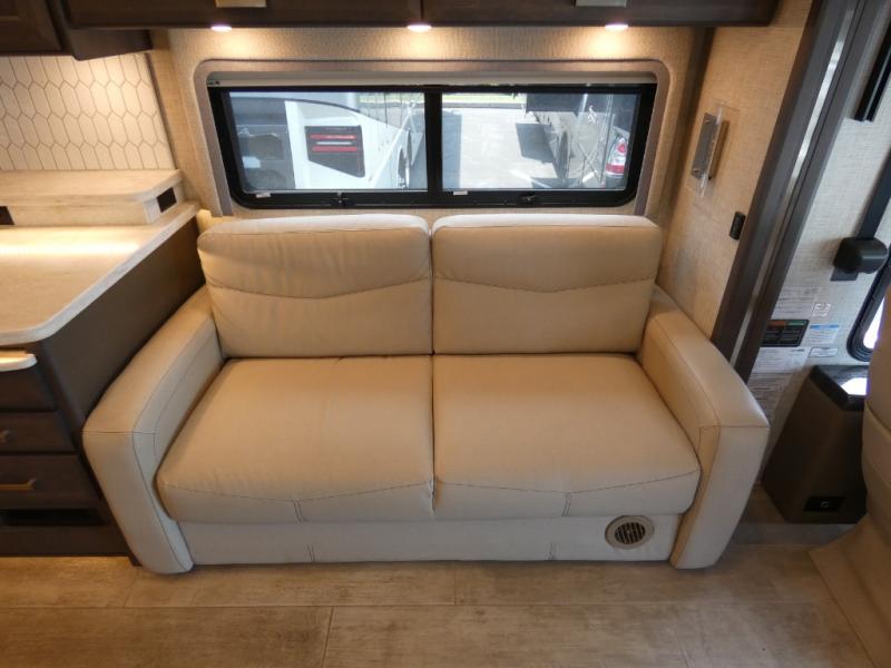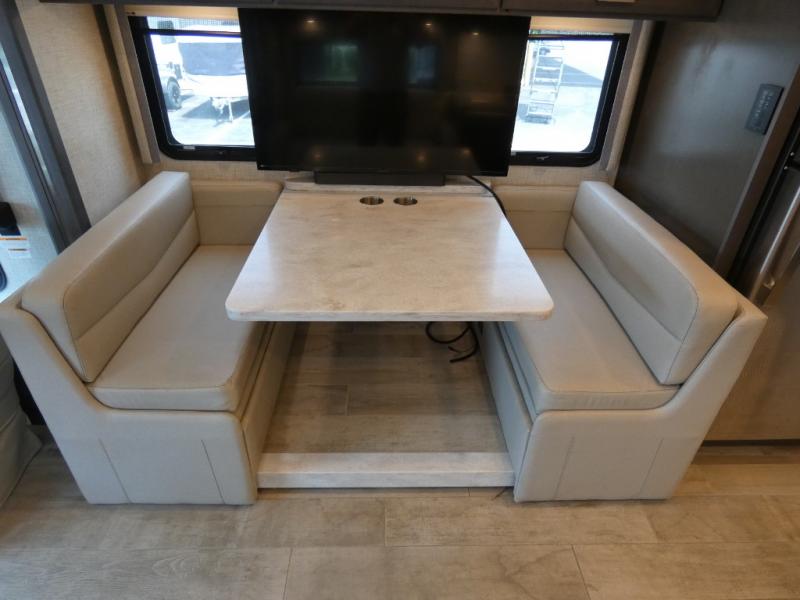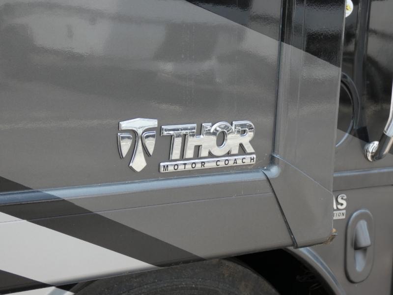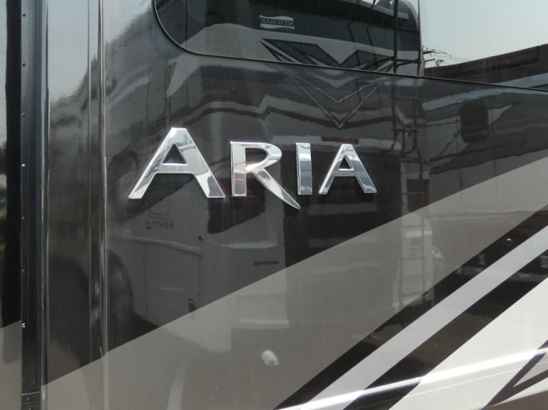 With any Aria Class A diesel motorhome by Thor Motor Coach, experience RV living with all the luxurious amenities you are accustom to, command the roadways with improved handling from the l-beam front axle with a 55-degree wheel cut, and enjoy a smooth ride thanks to the Air-Ride suspension and Sachs shock absorbers. The driver will also appreciate the 10.1" touchscreen dash radio with Bluetooth, navigation, and Sirius/XM prep when navigating the roads, and the comfort of the leatherette reclining/swivel adjustable captain's chairs. The bathroom provides an oversized full height shower with a glass door and a designer backsplash, while the kitchen provides solid surface countertops and a dinette. You will also enjoy designer tile backsplash, a large double bowl stainless steel sink with a single handle faucet, a pull-down sprayer, plus full kitchen amenities. More standout features include the Studio Collection cabinetry with rake style doors and matte finish, living room pin-up lights, and polished porcelain tile flooring, plus much much more depending on the Aria you take on the road!