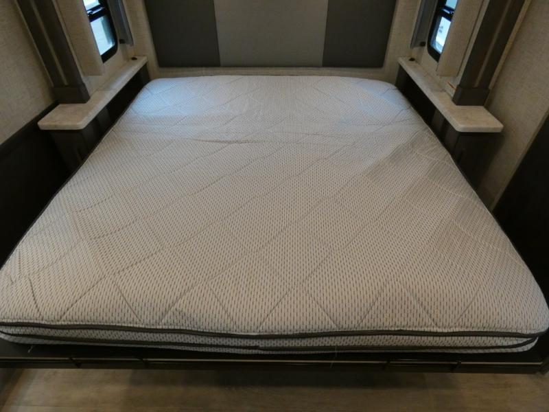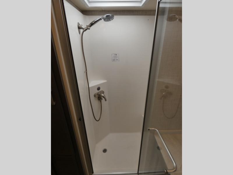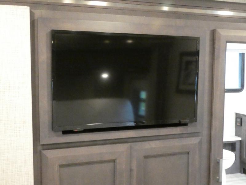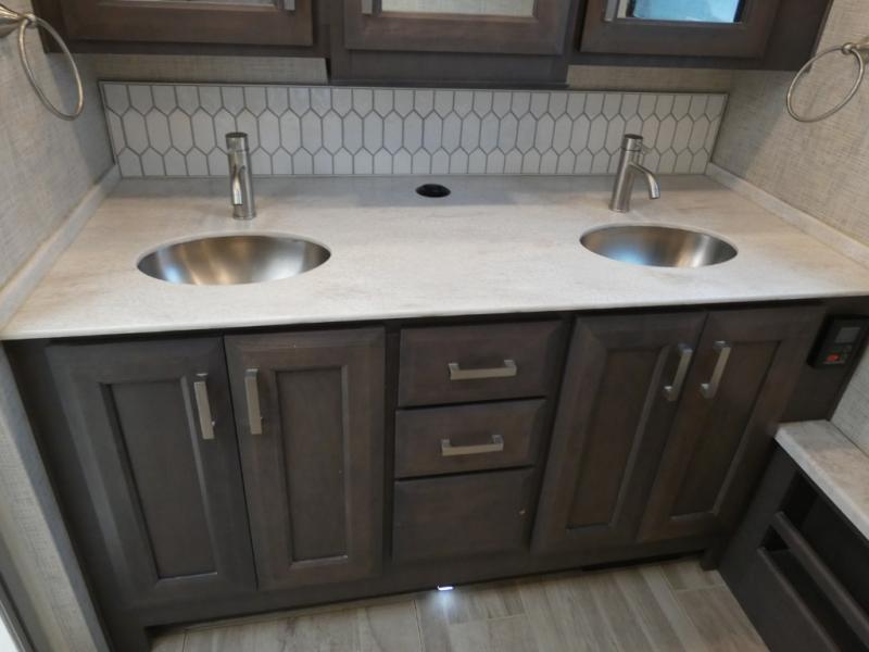 Not many coaches include two full bathrooms, yet this one does for total convenience! The spacious rear bathroom offers a dual-sink vanity and a 52" x 30" full-height shower with glass door that is located off of the walk-through master bedroom with a Tilt-A-View inclining king bed. The other bathroom is mid-coach, and includes a 24" x 34" full-height tub/shower and linen storage directly across from the bunk beds with drawers. In the front, the drop-down overhead bunk above the cab has a 32" TV to watch, and the main living area offers a 49" TV. There is a stackable washer/dryer next to the residential refrigerator allowing you to keep your linens clean and cook at the same time. When it is time to relax, the trifold sofa and Dream dinette, plus captain's chairs that swivel offer seating. And the power awning offers an outdoor living area that is covered for you to sit outside and visit or watch the exterior 39" TV.