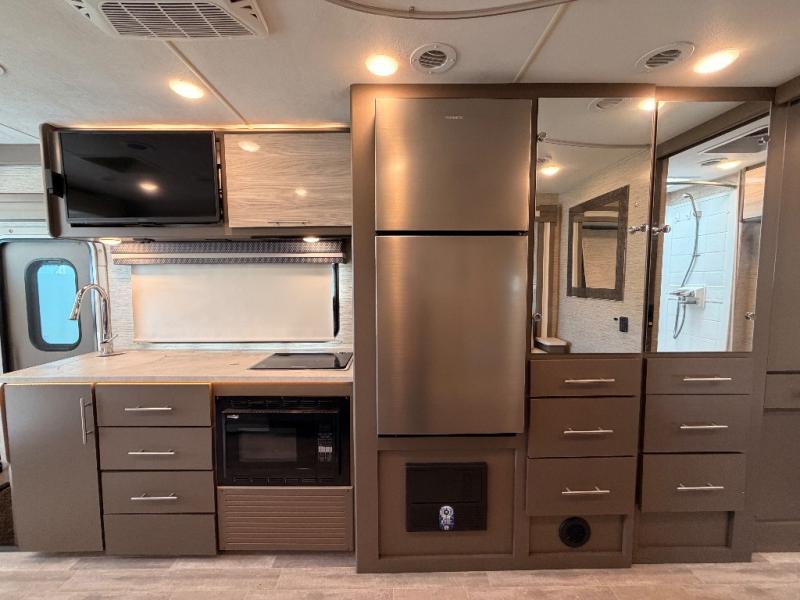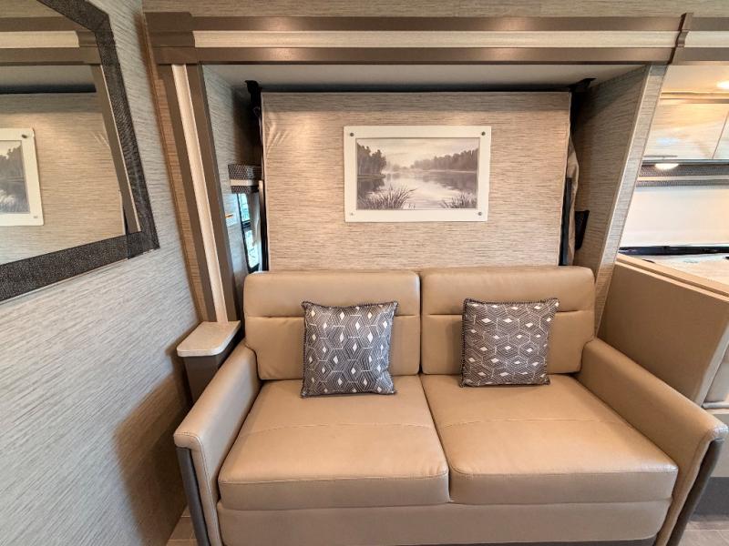 See new sights in this Class a gas motorhome that can sleep four to five people. Once you arrive at the campground, put out the full-wall slide to enjoy added space indoors, and you may want to play a game at the 75" booth dinette with cupholders. There is a 32" TV in the living area if you want to visit on the sofa, or you can set up the queen-size Murphy bed if you need a rest. The little ones are sure to love the power drop-down hideaway overhead bunk with a Cotton Cloud mattress and a bunk ladder for convenience. This model also includes a two burner gas cooktop and a convection microwave oven to prepare home cooked meals, plus there is a full rear bath on board to stay clean throughout your trip!