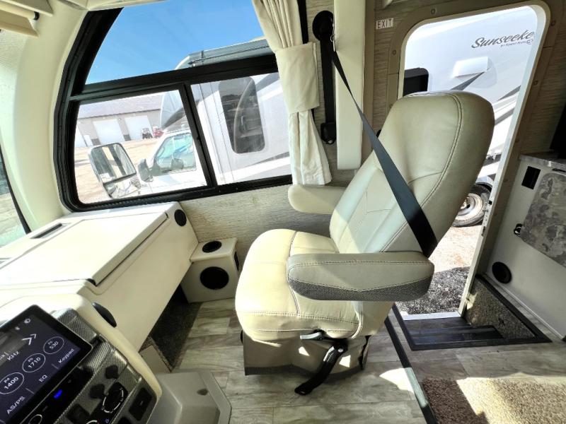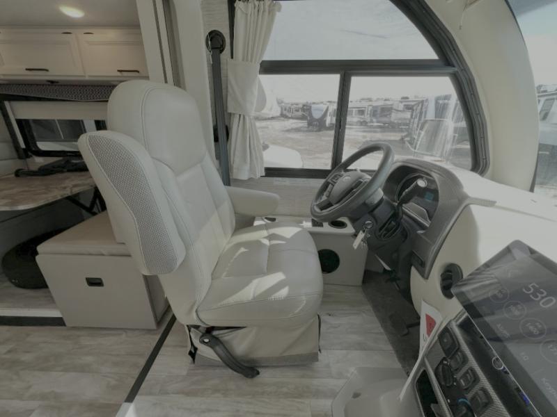 With any Axis RUV Class A gas motorhome by Thor Motor Coach you will enjoy added technology features to make each trip enjoyable, like the RapidCamp+ multiplex lighting and systems control and the Winegard ConnecT 2.0 Wi-Fi/4G/TV antenna. Each model features heated and remote exterior mirrors with integrated side view cameras, reclining and swivel leatherette captain's chairs, and a dash workstation with 110-volt and 12-volt outlets to get some work done if needed. Relaxing after a long day of traveling will be easy with the leatherette furniture, the Euro-style cabinet doors, and 82" interior ceiling height. The HD-MAX exterior with graphics package and black frameless windows provide a sleek look you are sure to love, and don't overlook the power awning with integrated LED lighting and lighted rotocast storage compartments for all your gear.