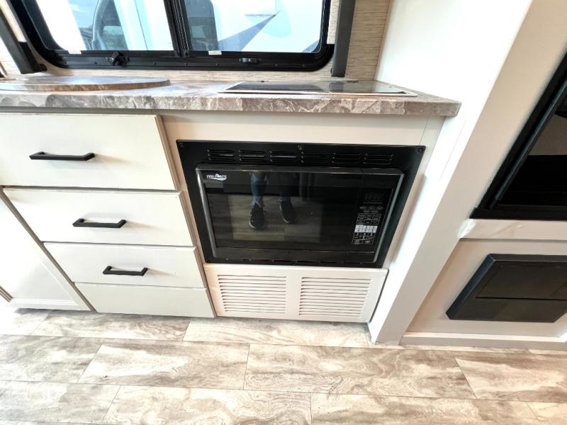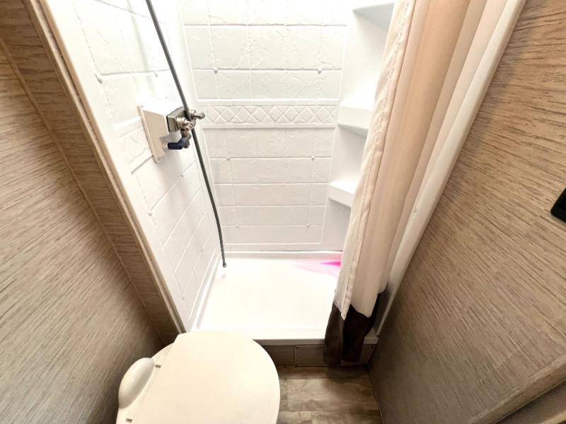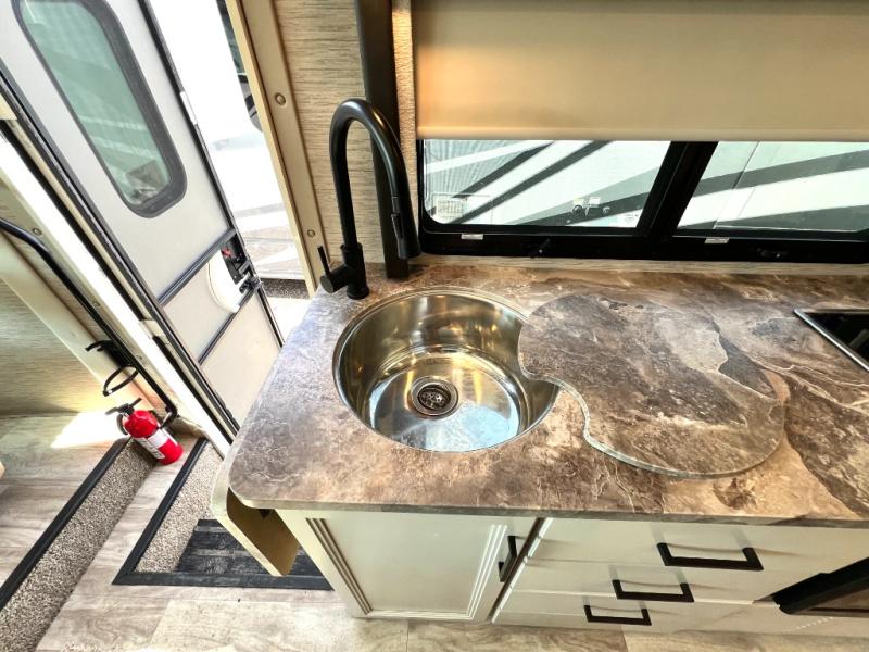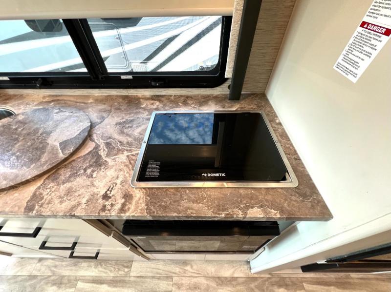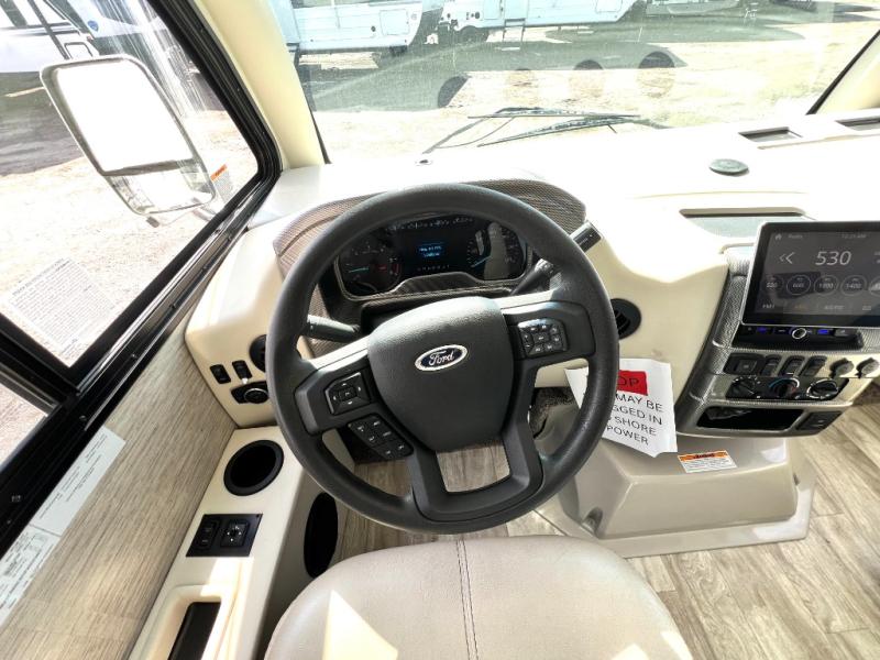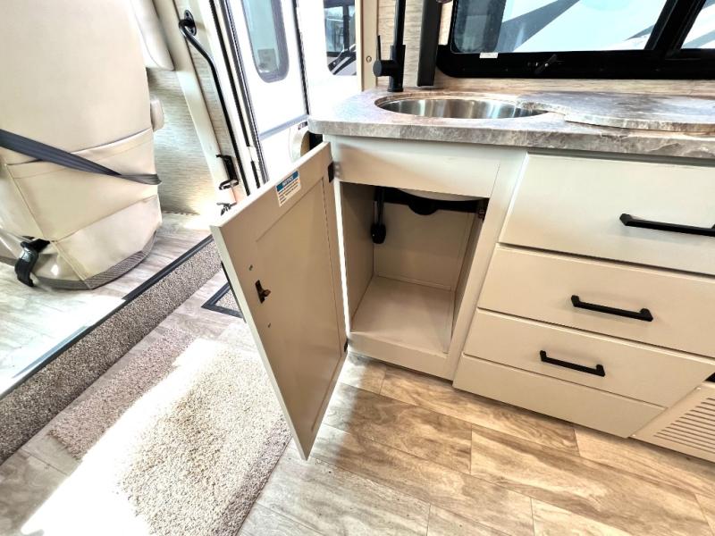 See new sights in this Class a gas motorhome that can sleep four to five people. Once you arrive at the campground, put out the full-wall slide to enjoy added space indoors, and you may want to play a game at the 75" booth dinette with cupholders. There is a 32" TV in the living area if you want to visit on the sofa, or you can set up the queen-size Murphy bed if you need a rest. The little ones are sure to love the power drop-down hideaway overhead bunk with a Cotton Cloud mattress and a bunk ladder for convenience. This model also includes a two burner gas cooktop and a convection microwave oven to prepare home cooked meals, plus there is a full rear bath on board to stay clean throughout your trip!