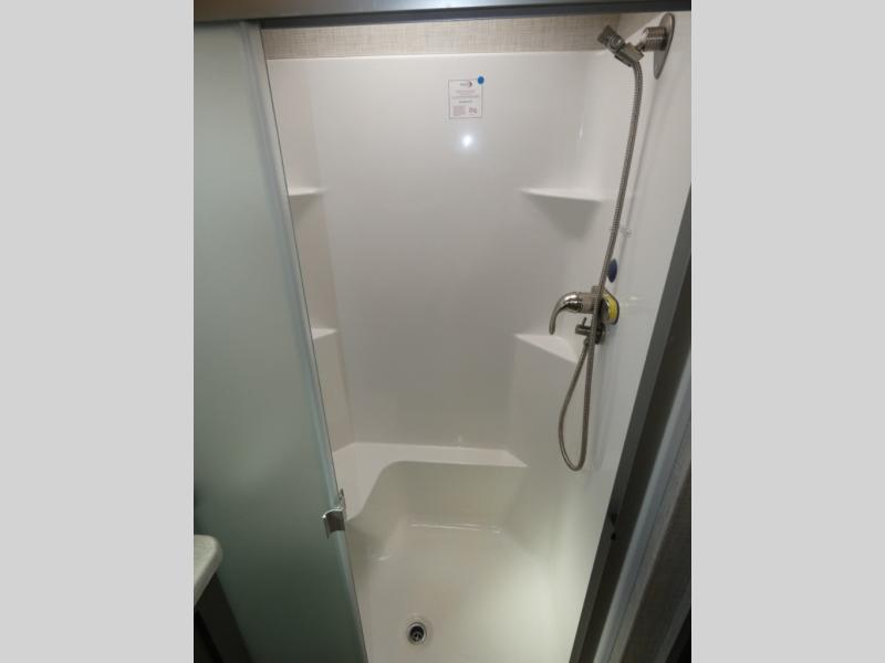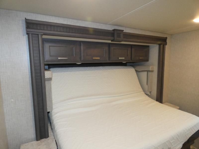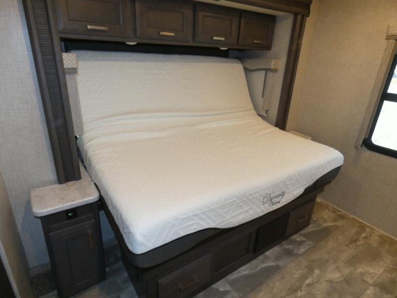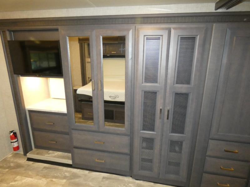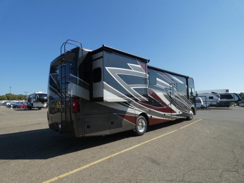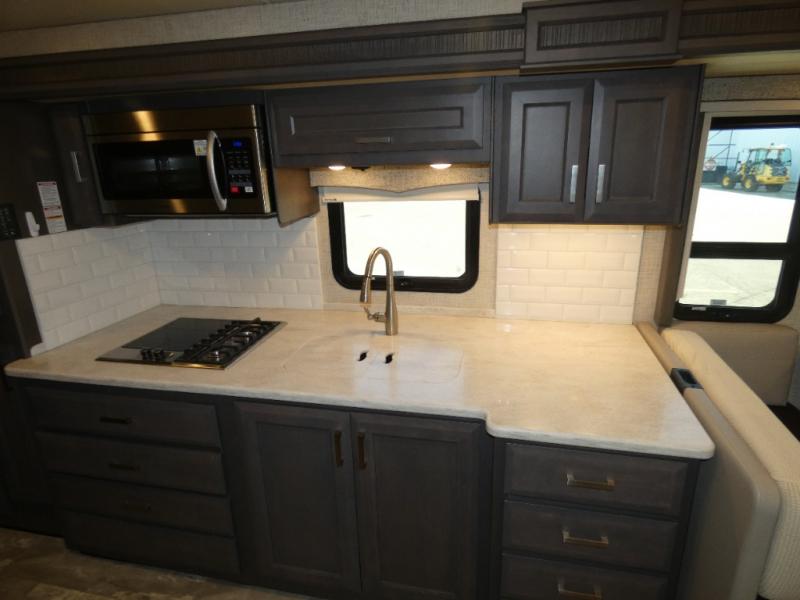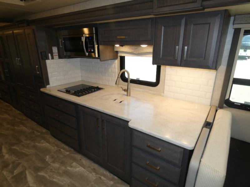 The full-wall slide on this coach means more space to relax, plus there is a second slide out in the rear bedroom that will give you room to get dressed each morning. Breakfast can be made on the two burner gas range, or in the convection microwave. There is a residential refrigerator for perishables, and a pantry for snacks! You will love to visit with friends on the 68" jackknife sofa, dine at the 78" Dream Dinette, and relax under the 20' power awning with LED lighting. This model includes a full bath with a one-piece fiberglass shower and a Shower Miser hot water recycling system you are sure to appreciate. You will get a great night's rest each night on the Tilt-A-View inclining king bed, plus there is a 32" bedroom TV for late-night movies in bed.