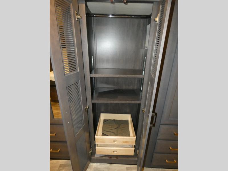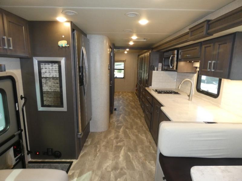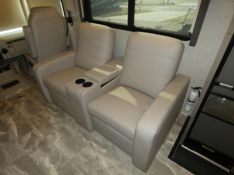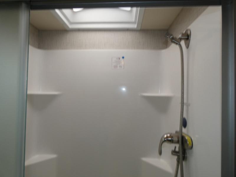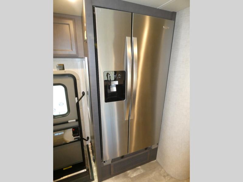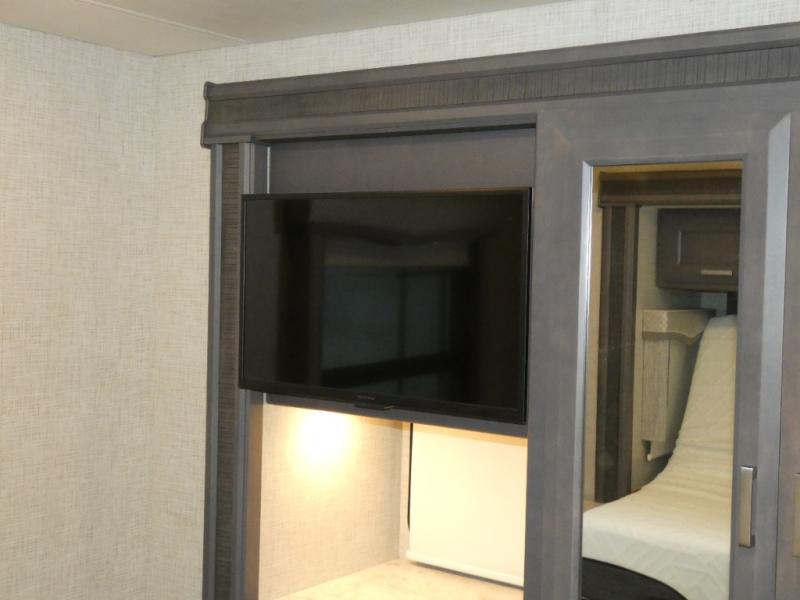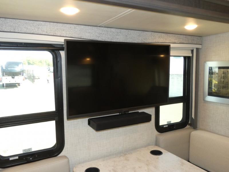 The full-wall slide on this coach means more space to relax, plus there is a second slide out in the rear bedroom that will give you room to get dressed each morning. Breakfast can be made on the two burner gas range, or in the convection microwave. There is a residential refrigerator for perishables, and a pantry for snacks! You will love to visit with friends on the 68" jackknife sofa, dine at the 78" Dream Dinette, and relax under the 20' power awning with LED lighting. This model includes a full bath with a one-piece fiberglass shower and a Shower Miser hot water recycling system you are sure to appreciate. You will get a great night's rest each night on the Tilt-A-View inclining king bed, plus there is a 32" bedroom TV for late-night movies in bed.