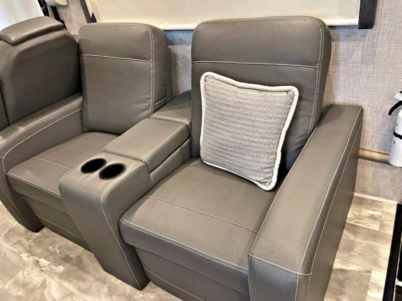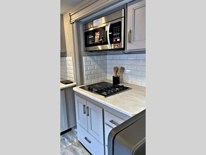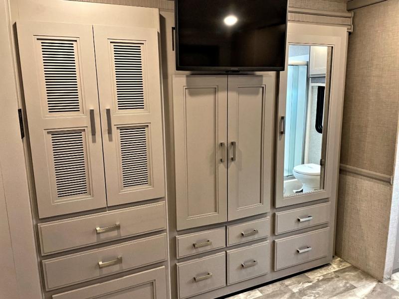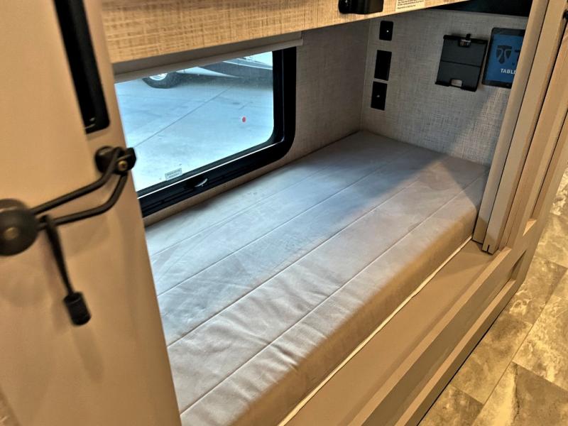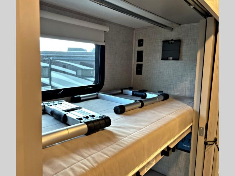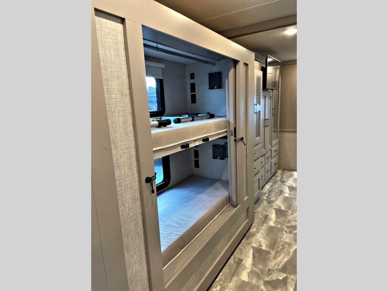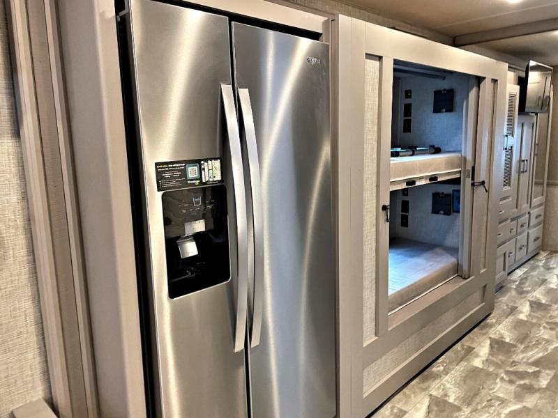 Two full baths make this coach the perfect family-friendly motorhome. Once you arrive at the campground, the little ones can make their bed on the drop-down overhead bunk, plus there are bunk beds across from one of the full baths for convenience. You will have your own master bedroom with a king bed slide out, a closet to keep your clothes tidy, plus washer and dryer prep. Head to the kitchen to find a residential refrigerator, a 30" stainless steel over-the-range convection microwave, and a galley countertop extension to prep fresh veggies. After dinner is cleaned up you can dine at the 72" Dream Dinette, relax on the 68" jackknife sofa, or watch the big game outdoors on the exterior 40" TV!