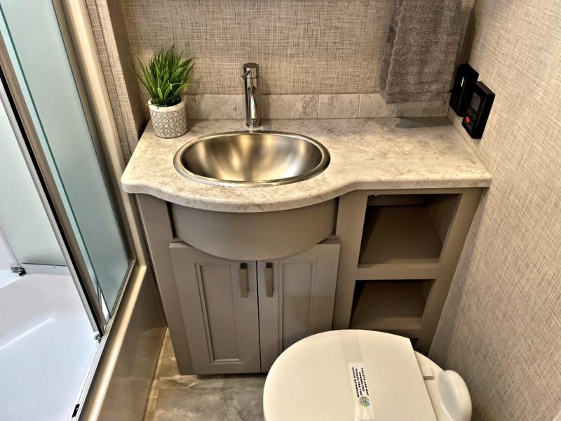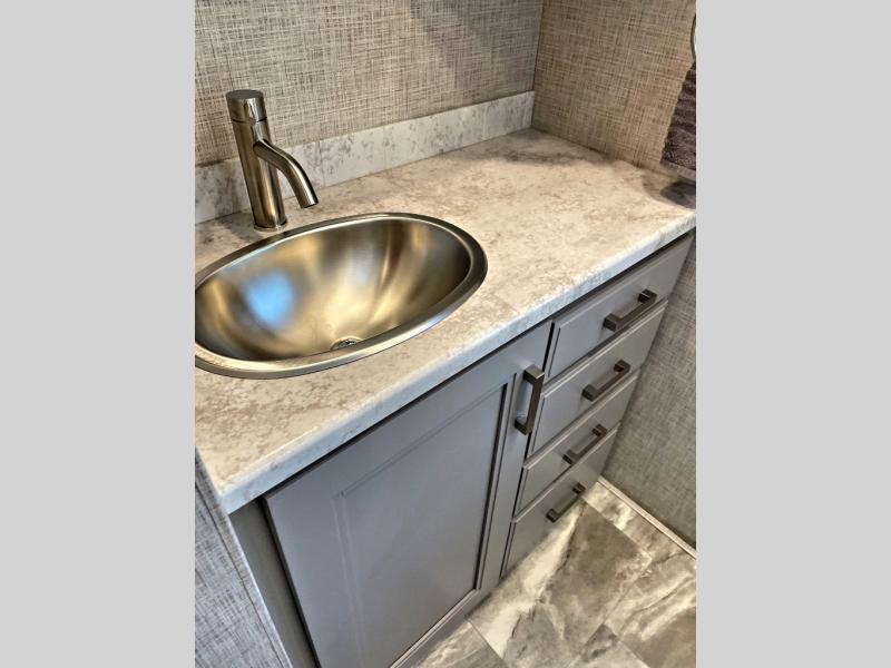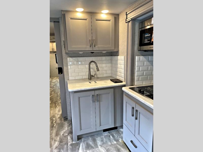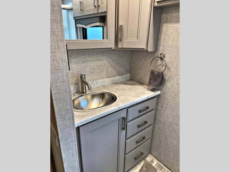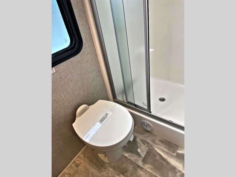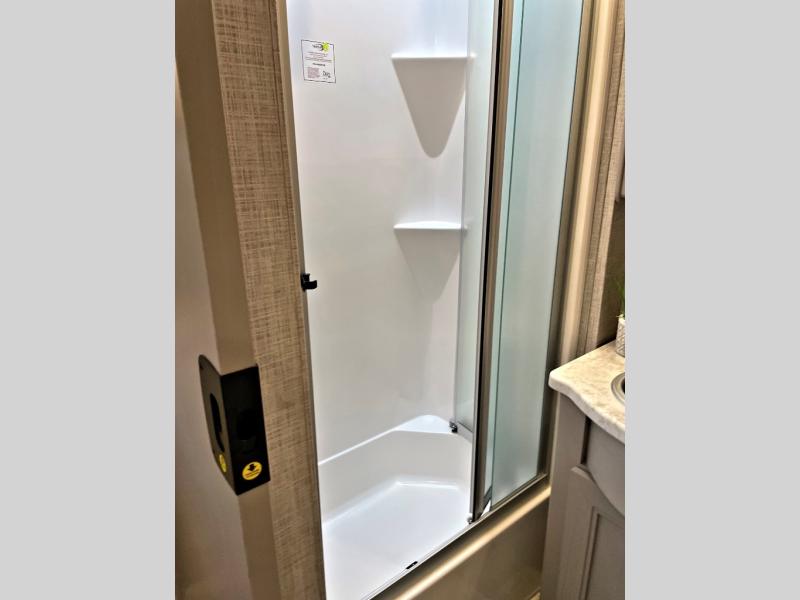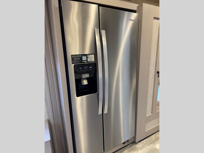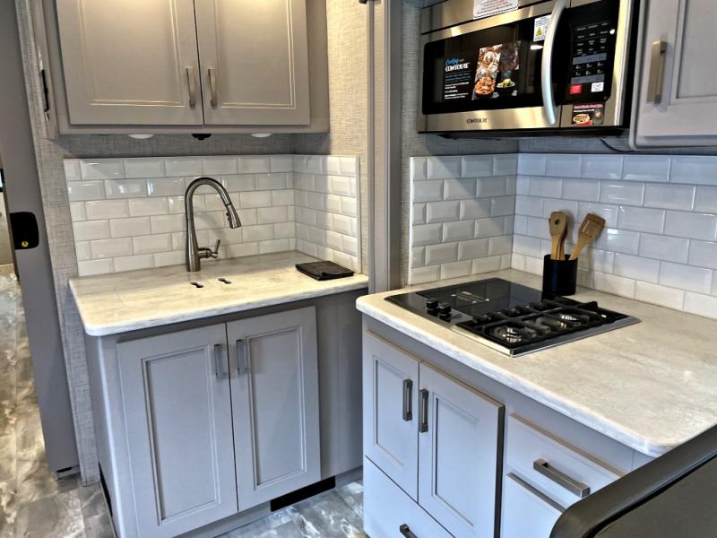 Two full baths make this coach the perfect family-friendly motorhome. Once you arrive at the campground, the little ones can make their bed on the drop-down overhead bunk, plus there are bunk beds across from one of the full baths for convenience. You will have your own master bedroom with a king bed slide out, a closet to keep your clothes tidy, plus washer and dryer prep. Head to the kitchen to find a residential refrigerator, a 30" stainless steel over-the-range convection microwave, and a galley countertop extension to prep fresh veggies. After dinner is cleaned up you can dine at the 72" Dream Dinette, relax on the 68" jackknife sofa, or watch the big game outdoors on the exterior 40" TV!