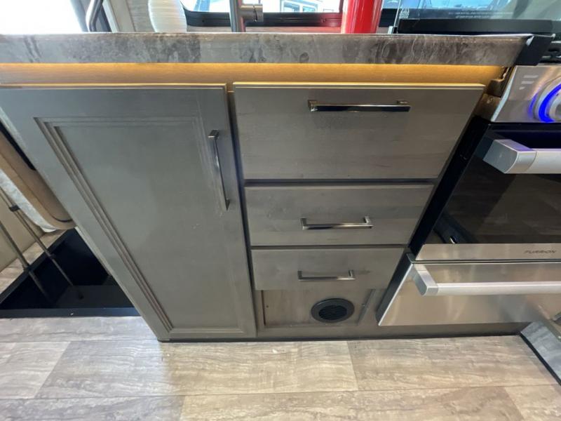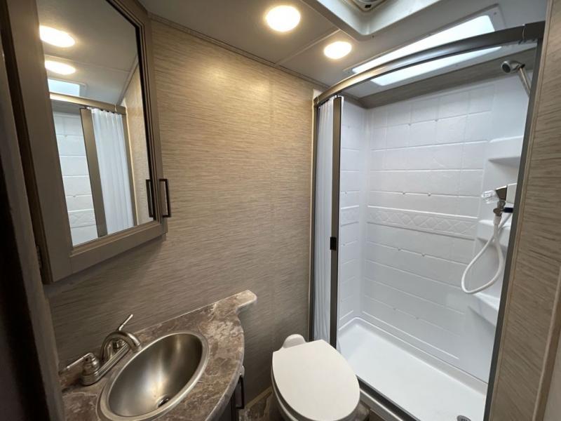 You will feel right at home traveling in this motorhome! After a long day of traveling, you can freshen up in the rear corner bathroom with the 24" x 36" shower that has a skylight above for more head space and natural lighting, plus robe hooks for added convenience. There are two closets to store your items, a pantry for snacks, and a refrigerator for your perishables. The 76" Dream Dinette is not only great for enjoying meals and playing card games, but also for transforming into an extra sleeping space. Speaking of sleeping, you also have a 60" x 74" queen bed slide to lay your head on and a 52" x 96" bunk over cab!