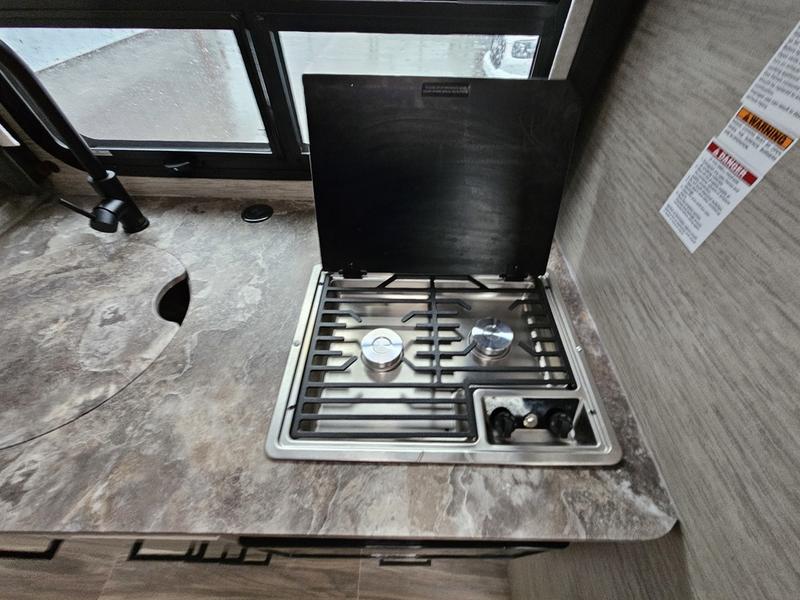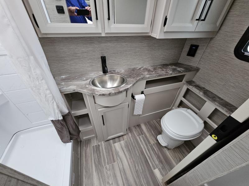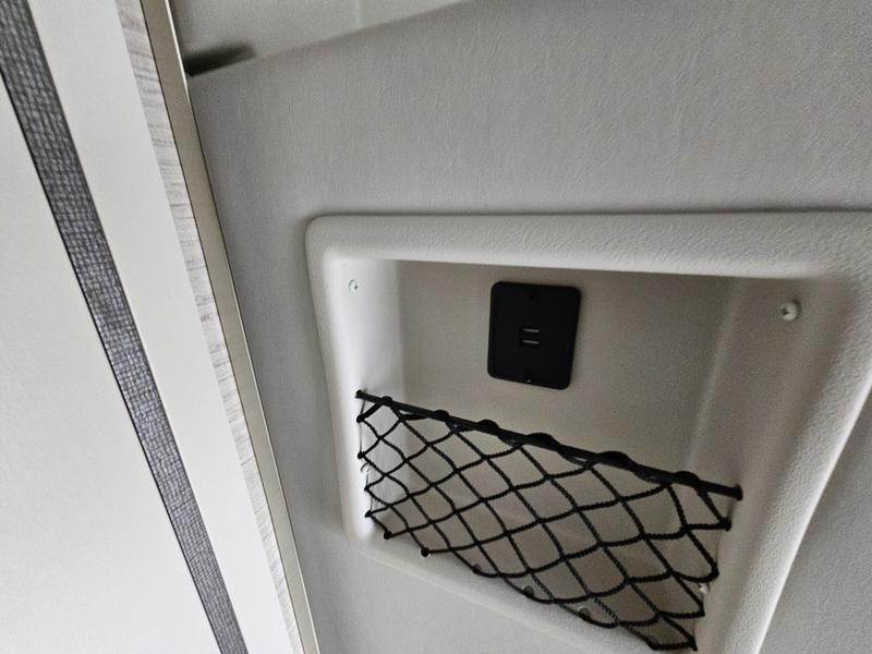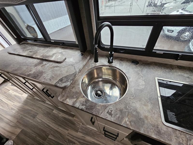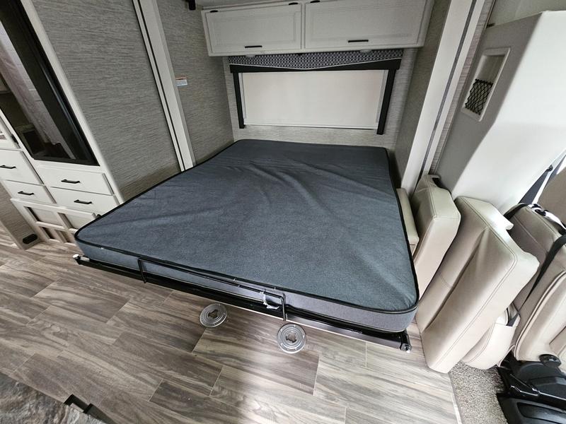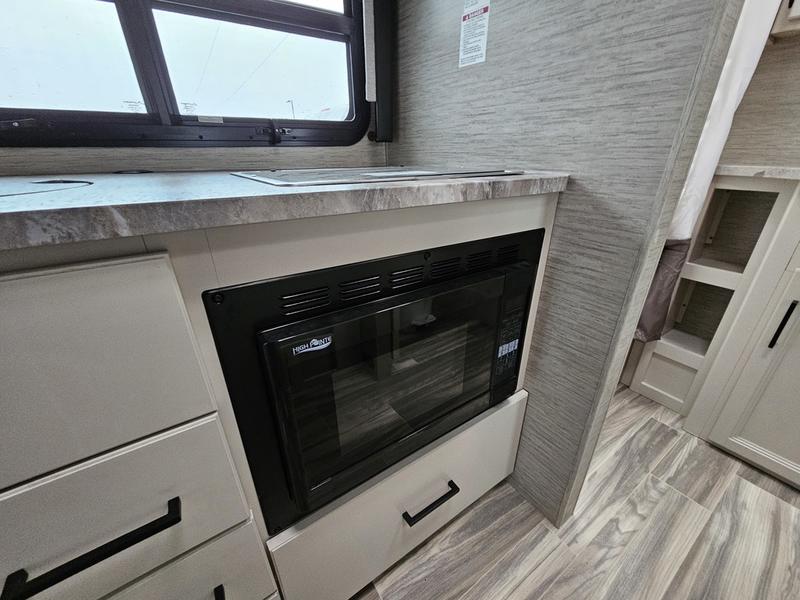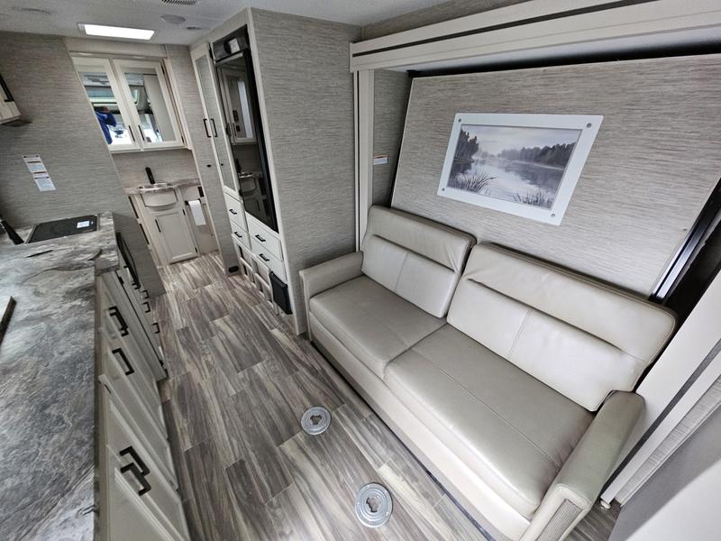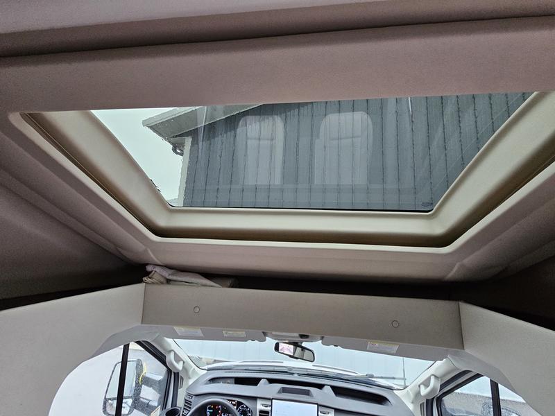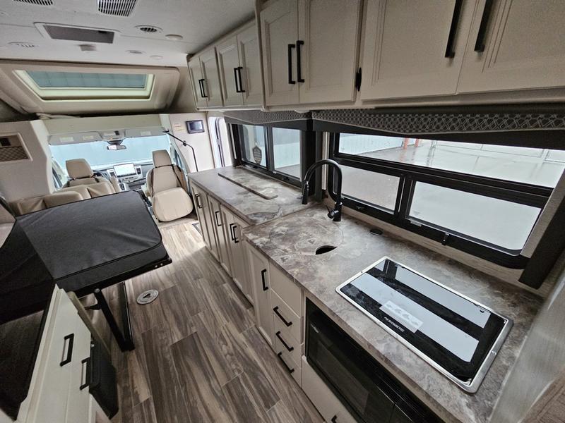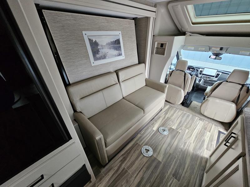 You'll have the perfect kitchen workspace in this Compass AWD Class B+ gas motorhome so that you can create plenty of home-cooked meals! There are pressed laminate countertops, a two-burner gas cooktop, task lighting above the cooktop, a convection microwave oven, a waste basket, and a ceiling vent. Because of the residential vinyl flooring, you'll have an easy time cleaning up after having guests over, and the wireless phone charger with USB plug next to the 39" retractable TV will get lots of use throughout your trips. The single slide holds the sofa with a pedestal table, and you can turn this sofa into a Murphy bed at night for a comfortable sleeping area.