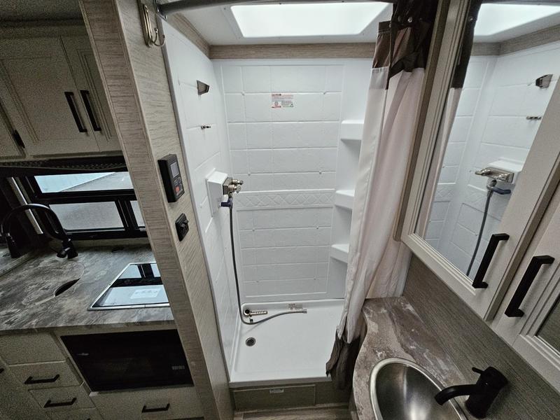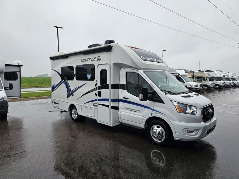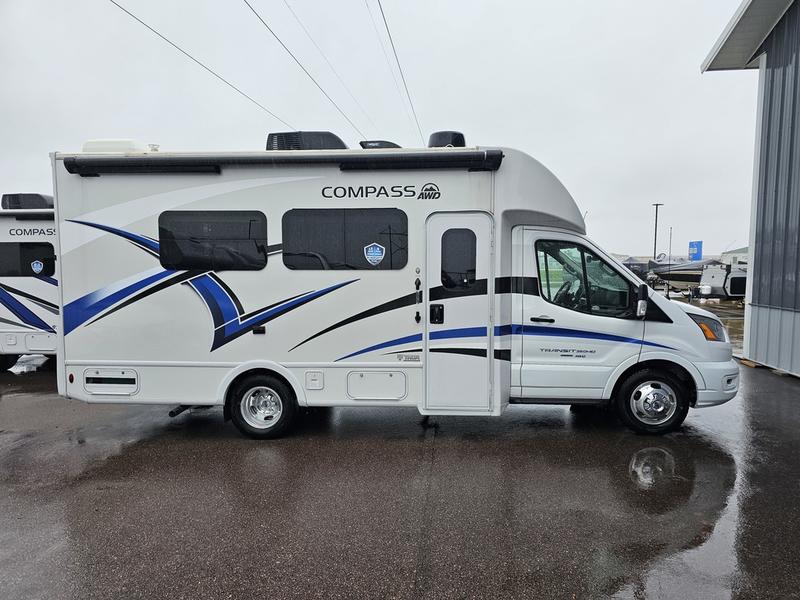 The Thor Motor Coach Compass AWD Class B+ gas motorhome is small but mighty! It includes all-wheel drive, and it is built upon a Ford Transit chassis, 3.5L V6 Eco Boost turbo gas engine, and Ford ten-speed automatic overdrive transmission. The Ford safety features provide excellent care while driving, and you can stay connected to your Compass AWD with the FordPass Connect. The power patio awning with LED lights can be moved out into position with just one touch on your cell phone thanks to the Rapid Camp+ multiplex control system. You will have a 100W solar panel with controller, a single roof air conditioner, a Winegard ConnecT 2.0 Wi-Fi/4G/TV antenna, and a tankless water heater as some of the top electrical and plumbing features.