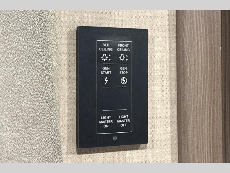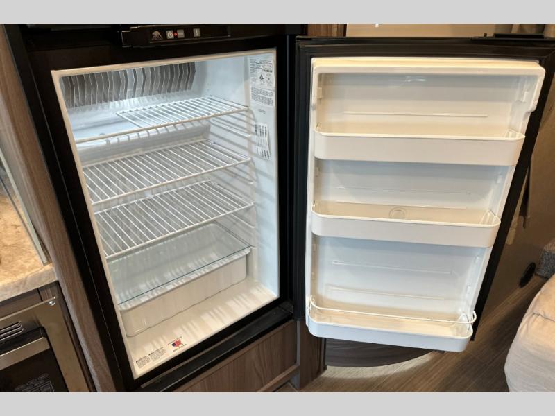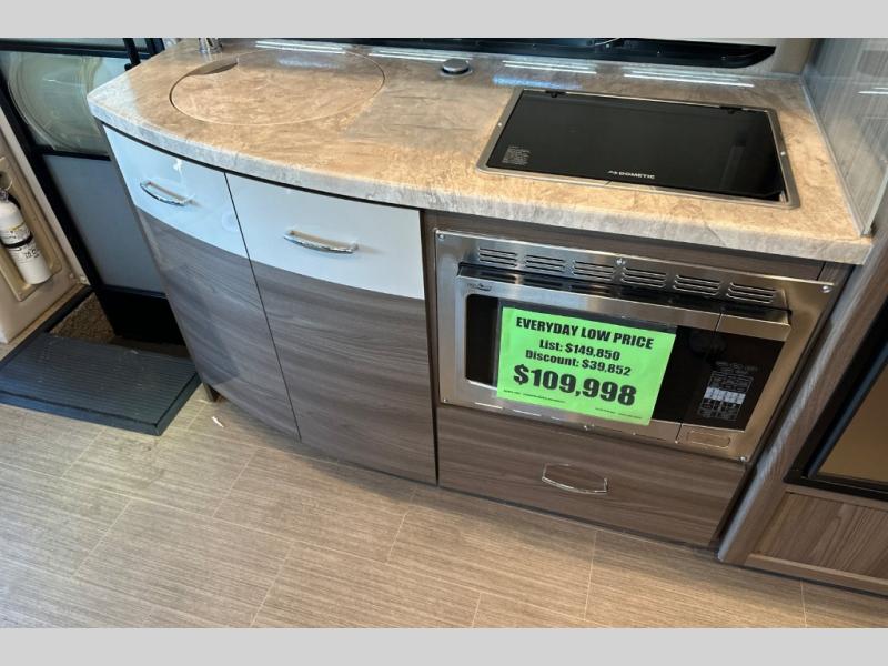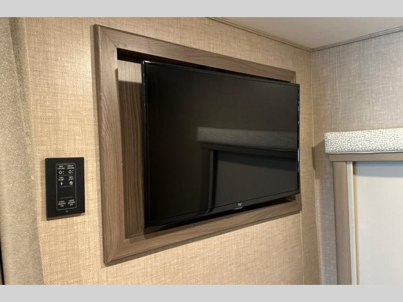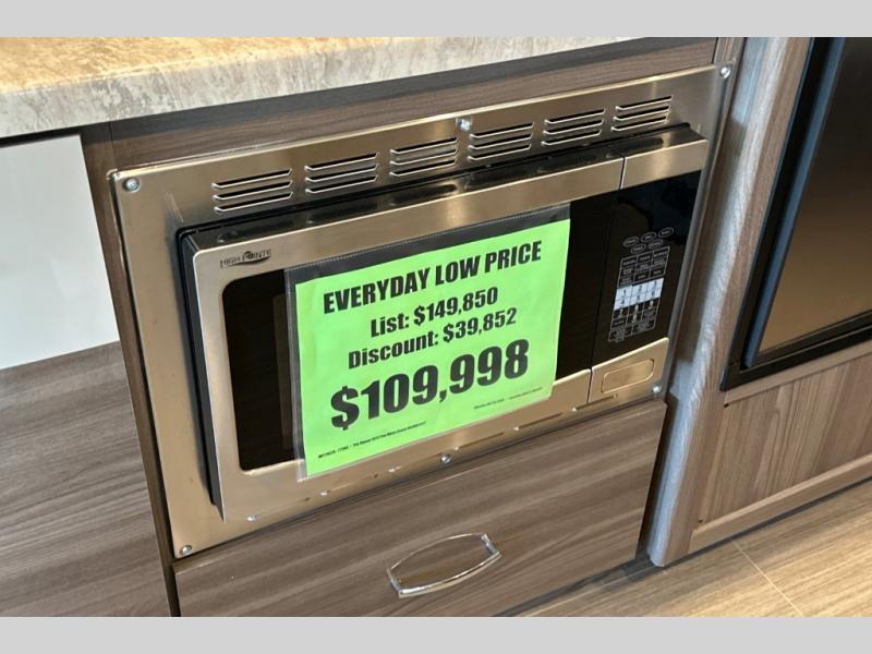 One look at this full-wall slide out coach and you'll be hooked! The swivel captain's seats can become a part of the living area once you're parked, and your guests can sit at the 76" Dream Dinette with footrests. Prepare lunch on the two burner gas cooktop, or use the convenient convection microwave. You'll find a large closet that can be used for clothes, food, or miscellaneous camp gear, plus there are overhead compartments for even more storage. The cab-over bunk provides additional sleeping space, and you'll enjoy the flip-up queen bed in the bedroom, along with a 32" TV.