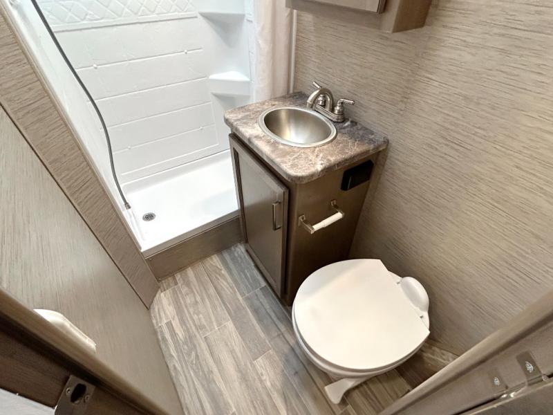Get ready to travel for long periods of time in this coach that offers sleeping space for five when you utilize the rear corner queen bed, the cab over bunk and the dream dinette. You and your friends will enjoy staying anywhere with the views out of the windows, the full bathroom only a few steps away and the kitchen amenities to feed everyone plus some. The chef will love the galley kitchen and being able to watch the 39" TV with swivel while cooking. You might even like to add an option or two such as an exterior 32" TV to enjoy while relaxing outside under the power awning with integrated LED lighting to enjoy at night.