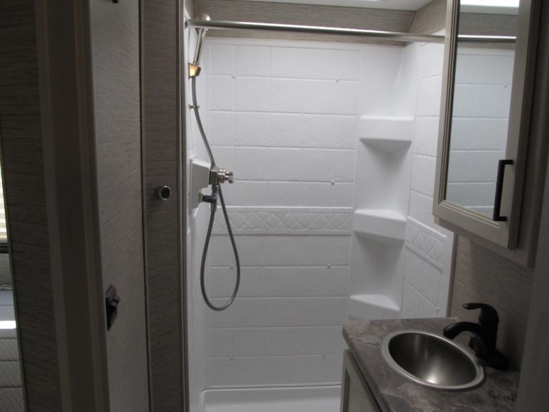 Get ready to travel for long periods of time in this coach that offers sleeping space for five when you utilize the rear corner queen bed, the cab over bunk and the dream dinette. You and your friends will enjoy staying anywhere with the views out of the windows, the full bathroom only a few steps away and the kitchen amenities to feed everyone plus some. The chef will love the galley kitchen and being able to watch the 40" TV with swivel while cooking. You might even like to add an optional exterior 32" TV to enjoy while relaxing outside under the power awning with integrated LED lighting to enjoy at night.
