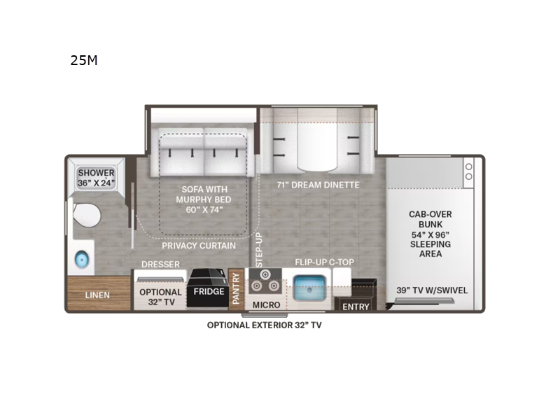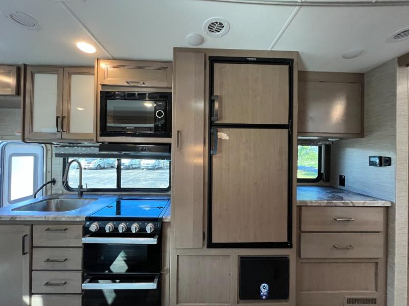 Its time to enjoy life and venture to see new places, enjoy events and visit with friends in your state or even further! You will love having a living area as well as a bedroom with the versatility of the Murphy bed and sofa combination. And the curtain allows you privacy when you have overnight guests sleeping on the dream dinette and the cab over bunk. You might like to add the 32" TV option across from the sofa if the 39" TV with swivel in the cab area isn't enough. There are full kitchen amenities for the cook including a double door refrigerator and a pantry to store all the goodies. And the sliding door into the rear full bathroom saves even more space for you to enjoy getting cleaned up and/or ready for bed or the next adventure.