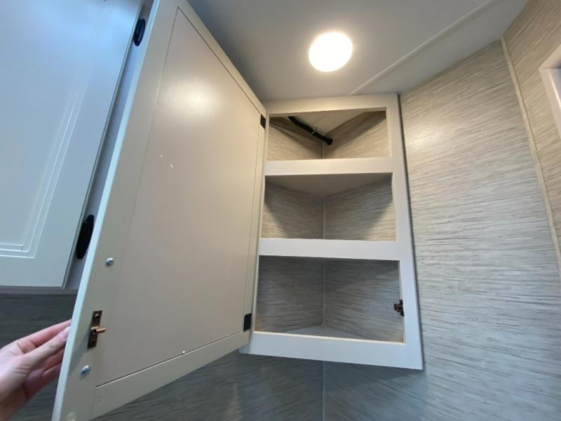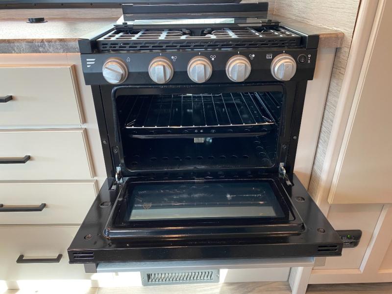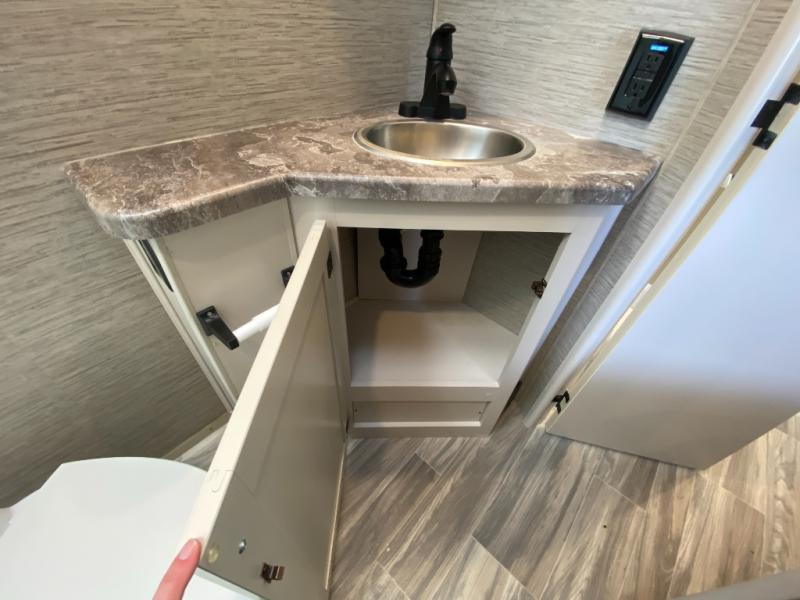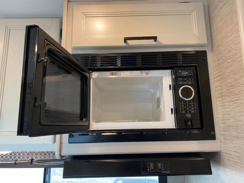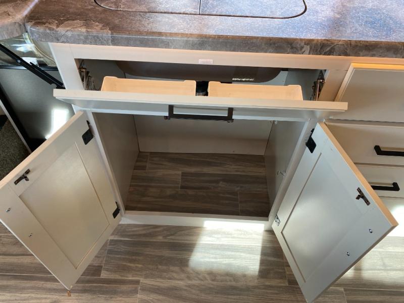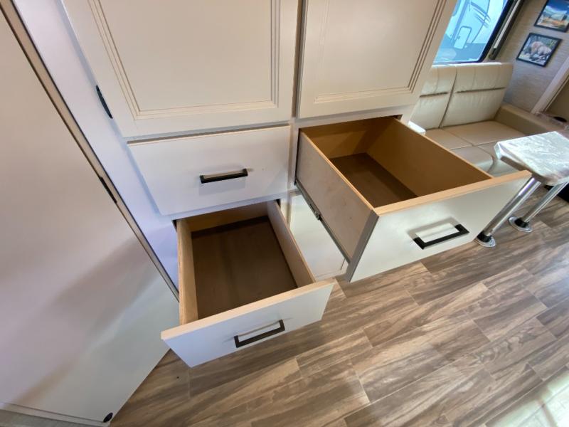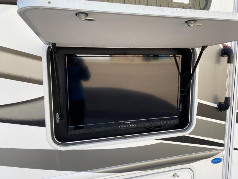 This coach is perfect for weekend trips to the lake or cross-country excursions. The mega storage rear door access lets you store belongings under the side-hinged frame fold-up full-size bed, and you'll find a closet inside as well for your clothes. There is plenty of counter space in the kitchen, along with a three burner gas cooktop, a microwave oven, and a double door refrigerator for perishables. This model includes a 68" sofa with a removable pedestal table with a great view of the 40" TV in the cab-over bunk. You might also like to add the optional exterior TV if you enjoy movies outdoors!