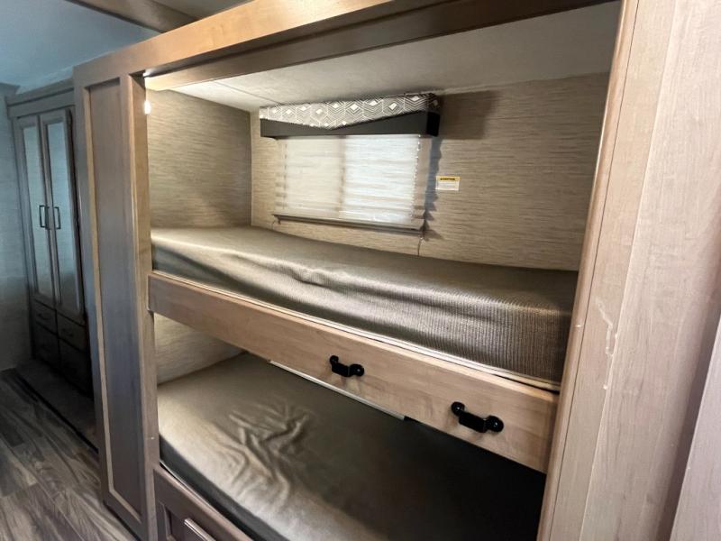 Planning a family vacation, a friend get-away or enjoy traveling with your partner? This coach offers a spacious interior thanks to the full-wall slide that stretches from behind the cab seats to the rear private bedroom. You can rest easy in your own queen bed with access to the double entry bathroom, your kids or guests will enjoy the bunk beds and cab over bunk to sleep on, plus the dream dinette and 68" jack-knife sofa offer even more sleeping space. And the kitchen amenities will impress anyone as they enter the mid-coach entrance. Everyone can watch the 40" TV over the cab that includes a swivel for the perfect view while visiting inside, or head outside to relax under the power awning with integrated LED lighting.