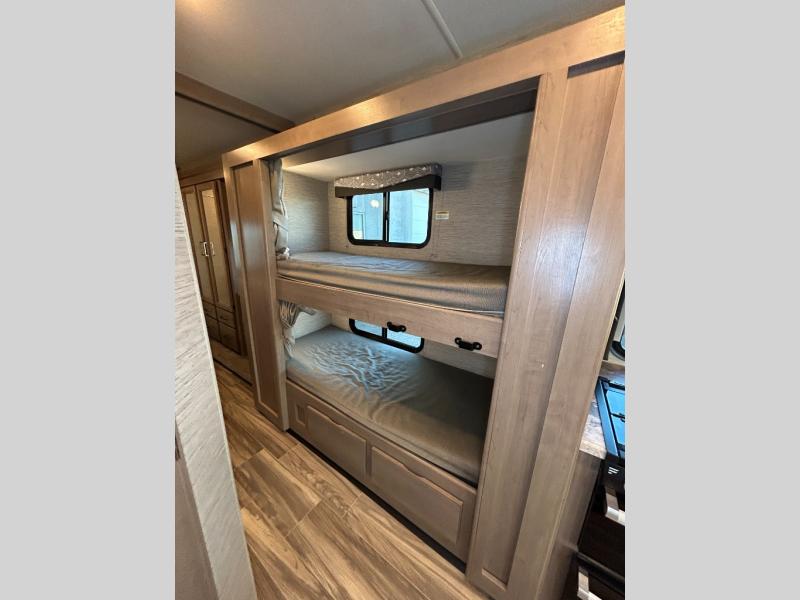 Planning a family vacation, a friend get-away or enjoy traveling with your partner? This coach offers a spacious interior thanks to the full-wall slide that stretches from behind the cab seats to the rear private bedroom. You can rest easy in your own queen bed with access to the double entry bathroom, your kids or guests will enjoy the bunk beds and cab over bunk to sleep on, plus the dream dinette and 68" jack-knife sofa offer even more sleeping space. And the kitchen amenities will impress anyone as they enter the mid-coach entrance. Everyone can watch the 39" TV over the cab that includes a swivel for the perfect view while visiting inside, or head outside to relax under the power awning with integrated LED lighting.