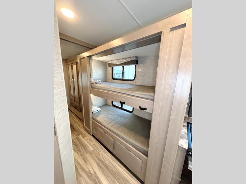 Planning a family vacation, a friend get-away or enjoy traveling with your partner? This coach offers a spacious interior thanks to the full-wall slide that stretches from behind the cab seats to the rear private bedroom. You can rest easy in your own queen bed with access to the double entry bathroom, your kids or guests will enjoy the bunk beds and cab over bunk to sleep on, plus the dream dinette and 68" jack-knife sofa offer even more sleeping space. And the kitchen amenities will impress anyone as they enter the mid-coach entrance. Everyone can watch the 39" TV over the cab that includes a swivel for the perfect view while visiting inside, or head outside to relax under the power awning with integrated LED lighting.