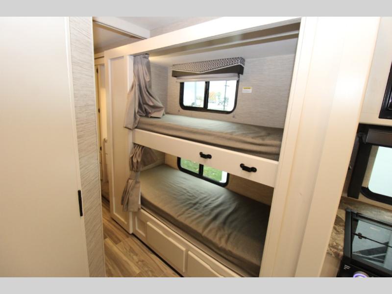 Planning a family vacation, a friend get-away or enjoy traveling with your partner? This coach offers a spacious interior thanks to the full-wall slide that stretches from behind the cab seats to the rear private bedroom. You can rest easy in your own queen bed with access to the double entry bathroom, your kids or guests will enjoy the bunk beds and cab over bunk to sleep on, plus the dream dinette and 68" jack-knife sofa offer even more sleeping space. And the kitchen amenities will impress anyone as they enter the mid-coach entrance. Everyone can watch the 40" TV over the cab that includes a swivel for the perfect view while visiting inside, or head outside to relax under the power awning with integrated LED lighting.