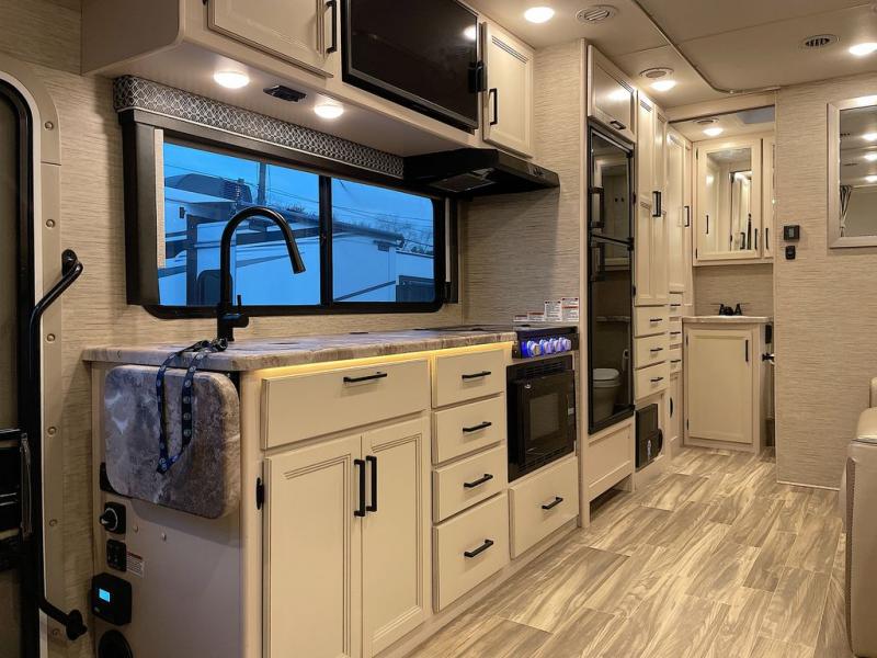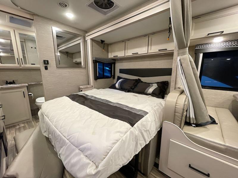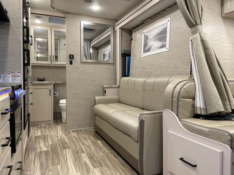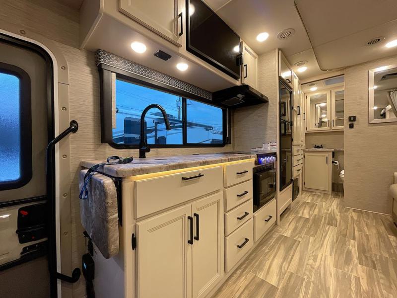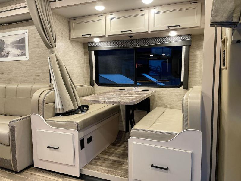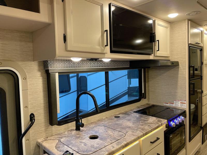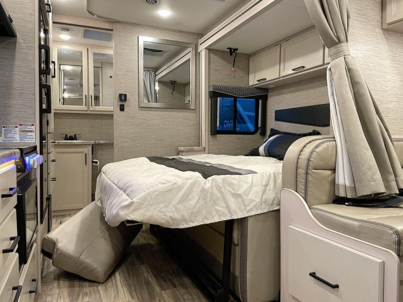 Travel comfortably in this Class C motorhome with a thoughtful layout including a Murphy bed for comfort at night and added floor space during the day. When you close up the Murphy bed you will have a sofa in its place. A 71" Dream Dinette allows for added seating during mealtime and for game playing, and it also can transform into sleeping space at night. Plus, you will have a 52" x 87" cab-over bunk that sleeps two adults or children as well. All will enjoy the full rear bath with space saving sliding door for privacy. Inside, a 36" x 24" shower plus a nice size closet for your clothing. A full kitchen including a 3 burner cook-top and microwave oven, plus ample counter space for food prep and a single bowl sink make it easy to provide meals while you travel.