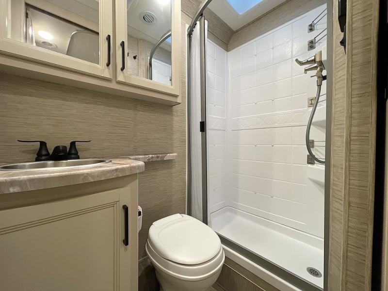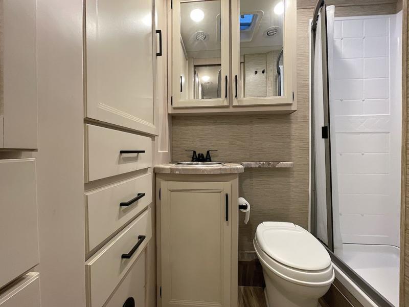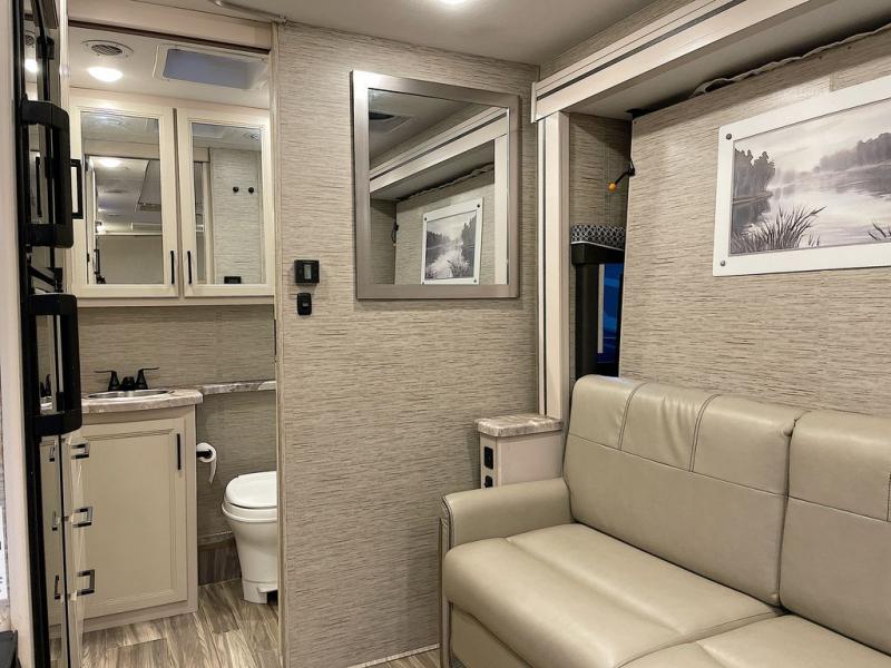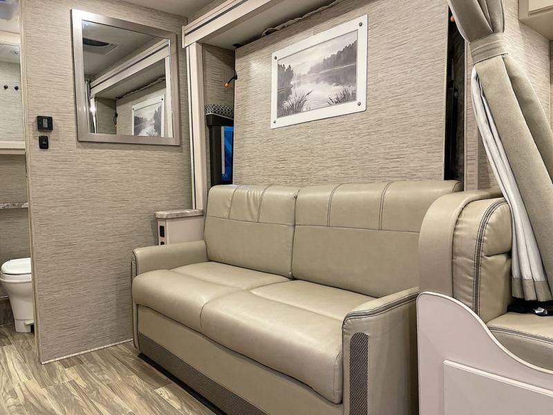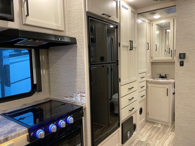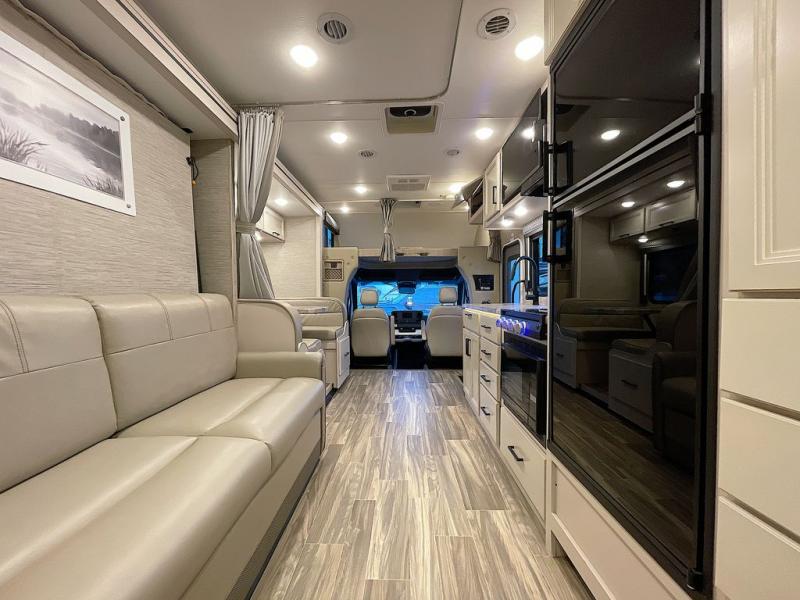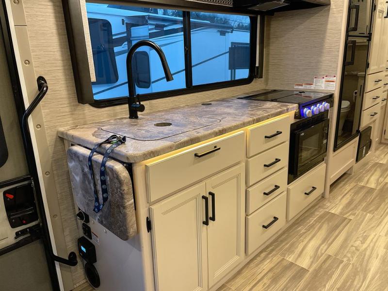 Travel comfortably in this Class C motorhome with a thoughtful layout including a Murphy bed for comfort at night and added floor space during the day. When you close up the Murphy bed you will have a sofa in its place. A 71" Dream Dinette allows for added seating during mealtime and for game playing, and it also can transform into sleeping space at night. Plus, you will have a 52" x 87" cab-over bunk that sleeps two adults or children as well. All will enjoy the full rear bath with space saving sliding door for privacy. Inside, a 36" x 24" shower plus a nice size closet for your clothing. A full kitchen including a 3 burner cook-top and microwave oven, plus ample counter space for food prep and a single bowl sink make it easy to provide meals while you travel.