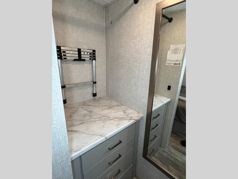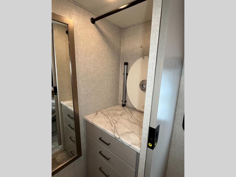 This double slide out coach can comfortably sleep six to seven people each night, so invite more friends along for the trip! Whether you're relaxing on the sofa bed across from the 39" TV, or playing cards at the Dream Dinette, you are sure to enjoy yourself. This Hurricane kitchen includes a residential refrigerator which is sure to come in handy, plus there is a pantry to store snacks and all the appliances needed to prepare meals each day. Head to the rear private bedroom to find a king bed, your own 32" TV, plus a walk-in closet with a dresser/wardrobe and an area prepped to add an optional washer and dryer prep. Now, that's convenient!