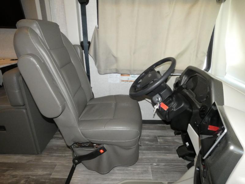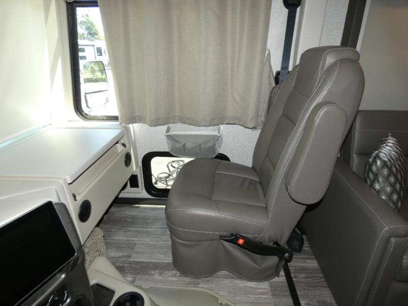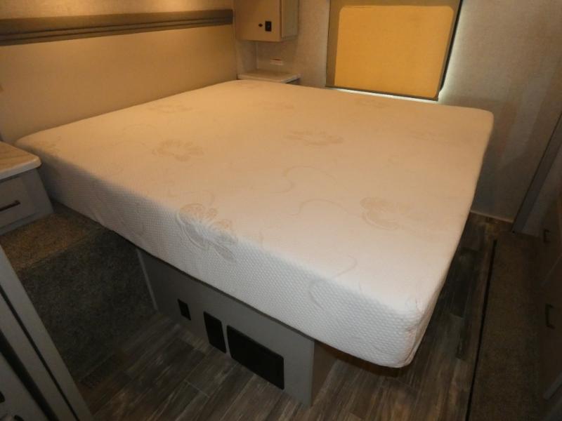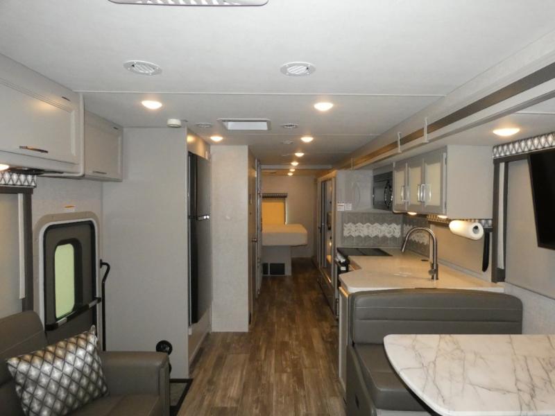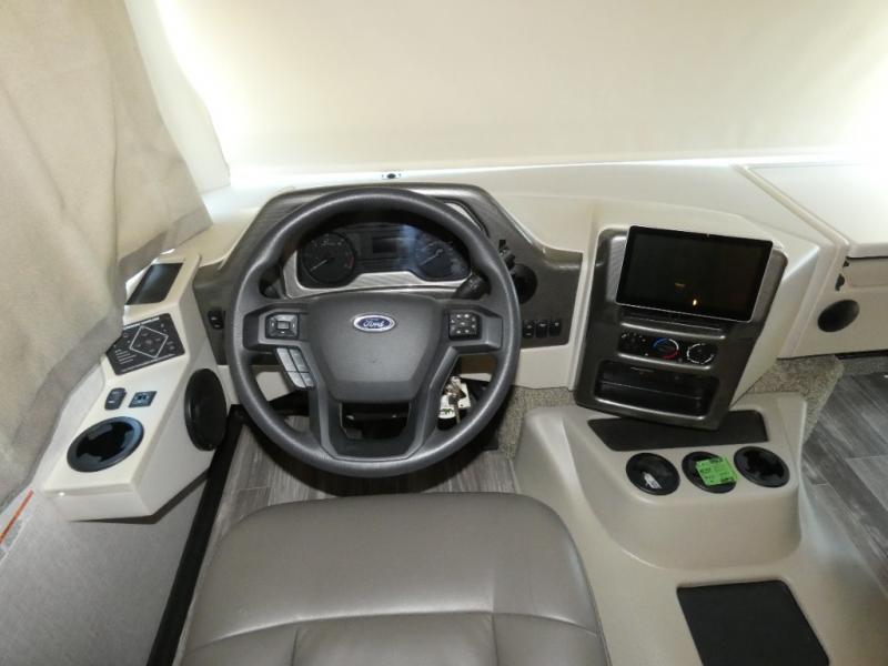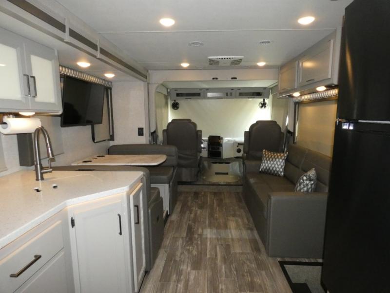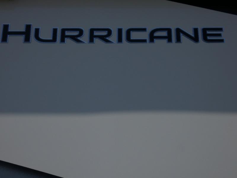 With any Hurricane Class A gas motorhome by Thor Motor Coach you will appreciate solid construction materials, like the welded tubular steel floor and the Vacu-Bond laminated roof, walls, and floor with block foam insulation. Each model sits on a Ford F-53 chassis with a 7.3L Triton V8 engine for power you can feel, plus there is an 8,000 lb. trailer hitch with a 7-pin round connector to pull your car along. The Rapid Camp+ multiplex system with Bluetooth will allow you to easily set up camp from the convenient 7" touchscreen provided, and the Winegard ConnecT WiFi extender +4G will let you catch up on work if needed. The Hurricane includes pressed laminated countertops inside, as well as residential vinyl flooring, decorative glass and tile backsplash in the kitchen, and many more at-home comforts.
