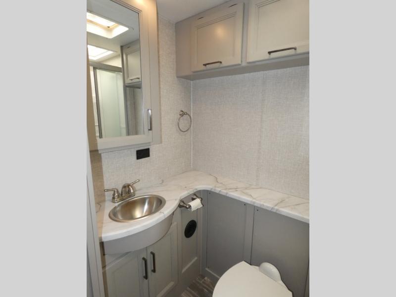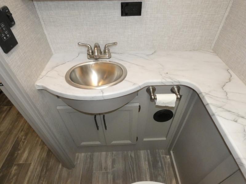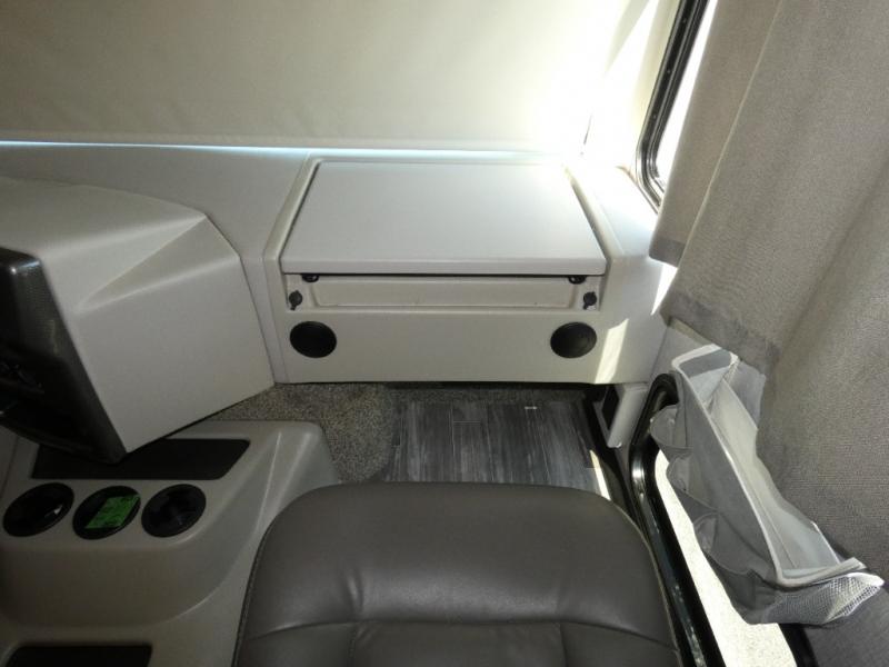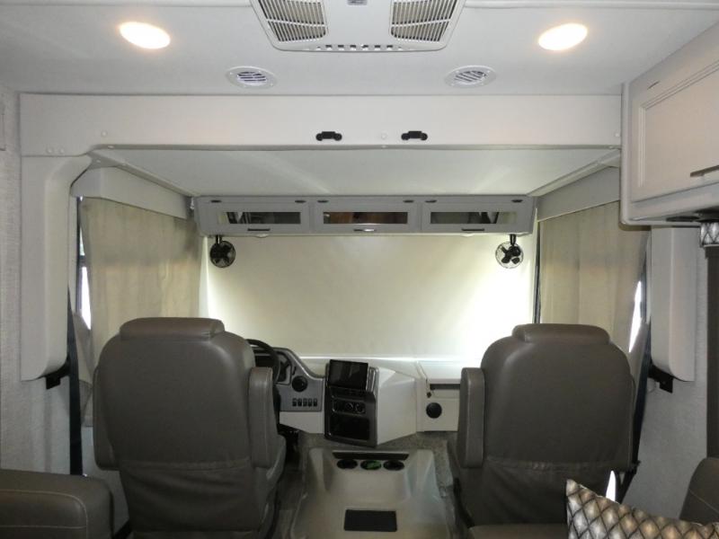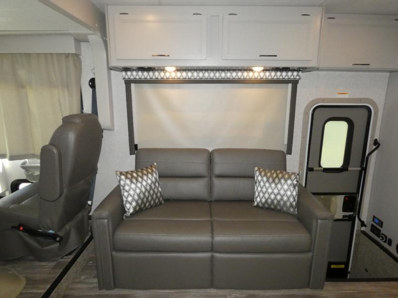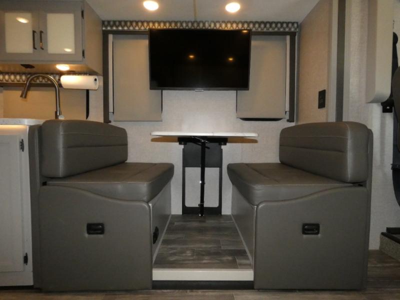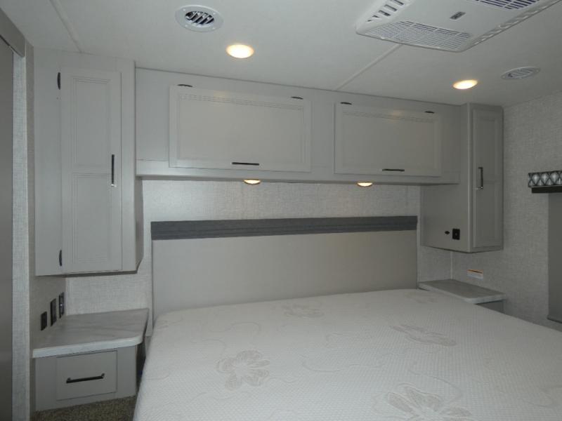 With any Hurricane Class A gas motorhome by Thor Motor Coach you will appreciate solid construction materials, like the welded tubular steel floor and the Vacu-Bond laminated roof, walls, and floor with block foam insulation. Each model sits on a Ford F-53 chassis with a 7.3L Triton V8 engine for power you can feel, plus there is an 8,000 lb. trailer hitch with a 7-pin round connector to pull your car along. The Rapid Camp+ multiplex system with Bluetooth will allow you to easily set up camp from the convenient 7" touchscreen provided, and the Winegard ConnecT WiFi extender +4G will let you catch up on work if needed. The Hurricane includes pressed laminated countertops inside, as well as residential vinyl flooring, decorative glass and tile backsplash in the kitchen, and many more at-home comforts.