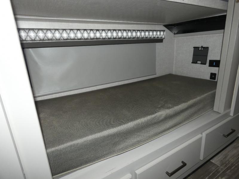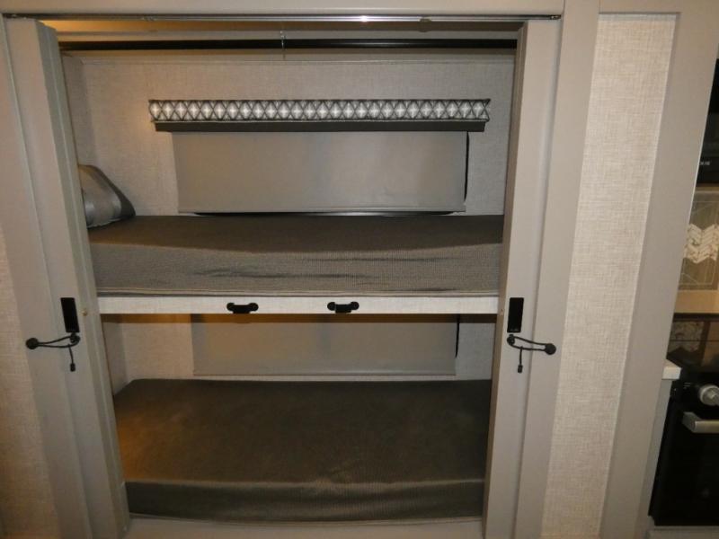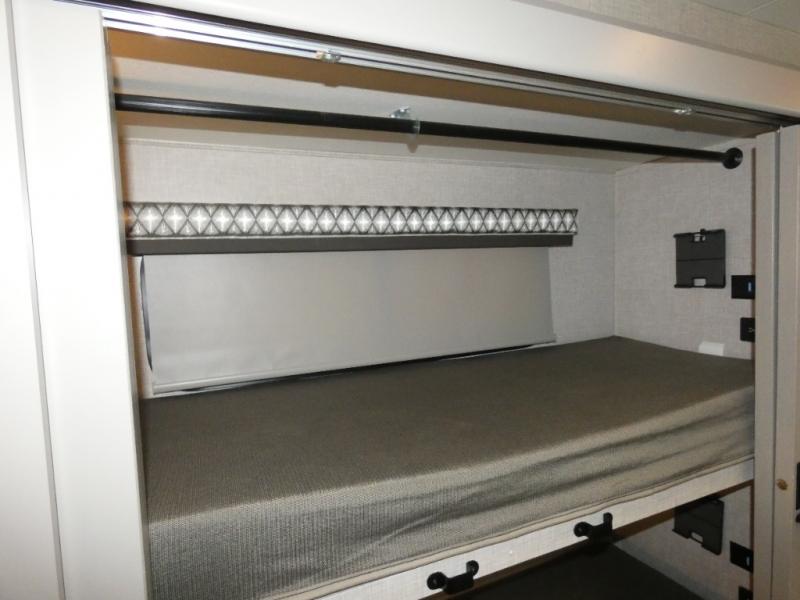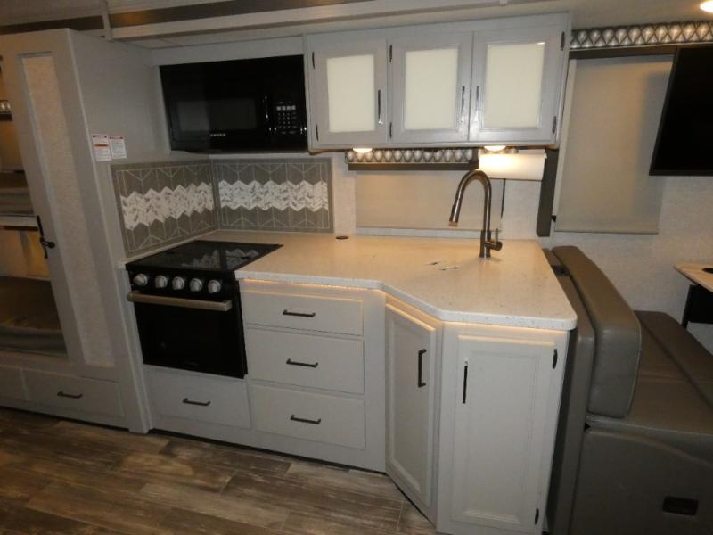 This is the family-friendly coach you've been searching for! You'll find a drop-down overhead bunk, plus bunk beds across from the full bath for convenience. The rear bedroom will feel just like home with its king bed, 32" bedroom TV, and a closet for your clothes. Additional sleeping is found on the sofa bed and the Dream Dinette, and the full-wall slide will let everyone stretch out. The chef of the group can prepare meals on the three burner gas cooktop or in the 30" over-the-range, plus this model includes an outdoor kitchen with a refrigerator and a sink for added convenience. Add that with the exterior 32" TV and you'll be the life of the campground!